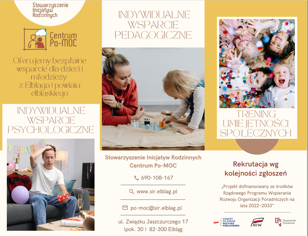 z przyjemnością informujemy, że Centrum Po-MOC w Elblągu oferuje bezpłatne wsparcie psychologiczne i pedagogiczne dla dzieci, młodzieży, rodziców oraz osób pracujących z rodzinami z Elbląga i powiatu elbląskiego.