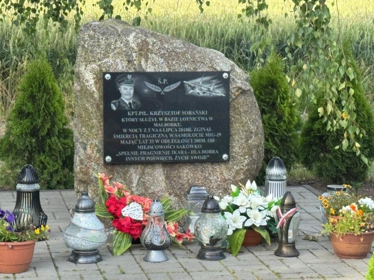 W niedzielę 6 lipca 2025 r. w Krasinie pod Pasłękiem, odbyło się uroczyste złożenie wiązanek kwiatów oraz zapalenie zniczy przy pamiątkowej tablicy poświęconej tragicznie zmarłemu w 2018 roku Ś.P. kpt. pilotowi Krzysztofowi Sobańskiemu z Bazy Lotnictwa koło Malborka.
