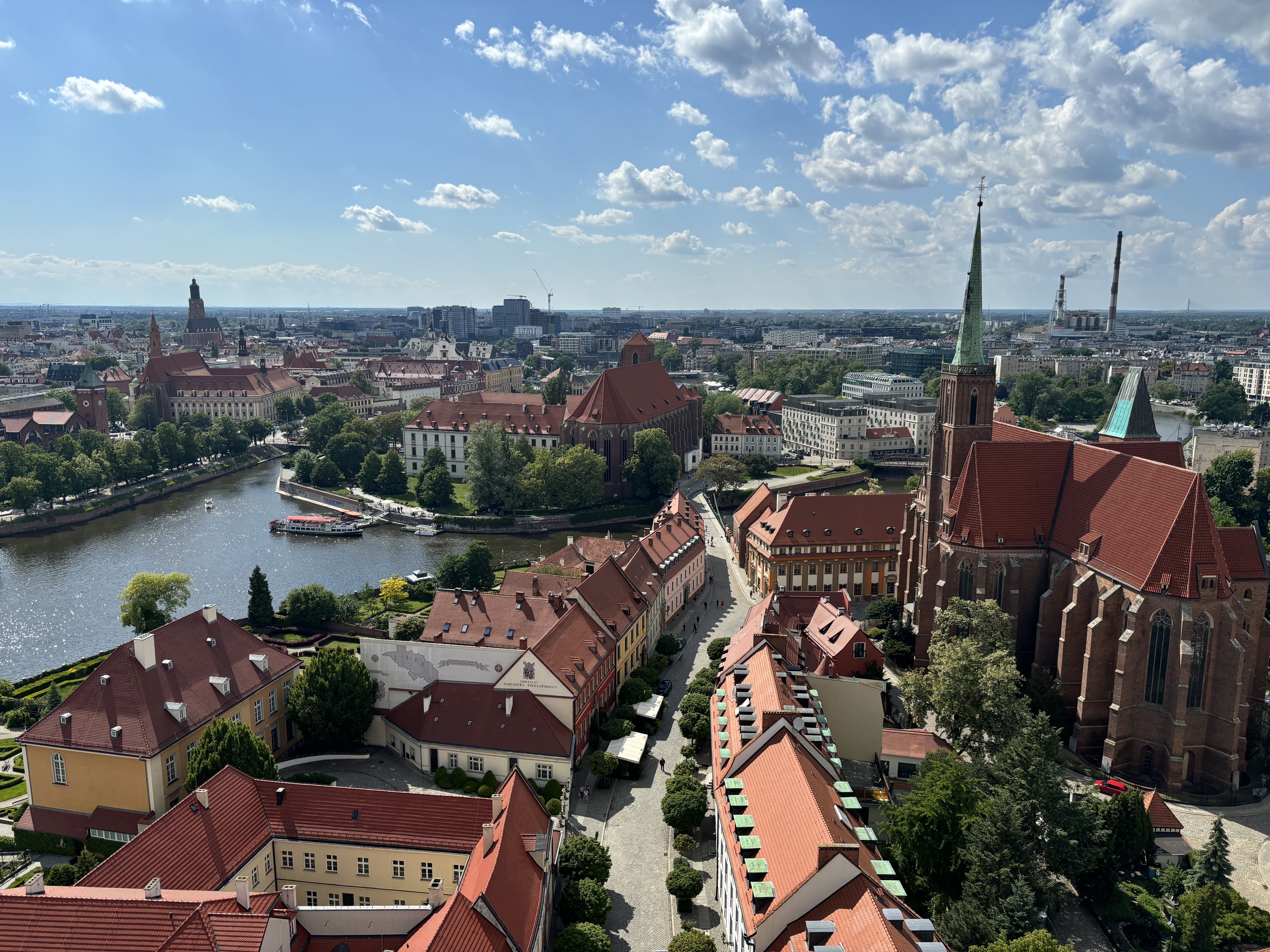 Zwiedzanie rozpoczęliśmy od Ostrowa Tumskiego – najstarszej części Wrocławia. Przewodnik, z pasją i humorem, opowiedział o początkach miasta oraz o znaczeniu tej dzielnicy w historii Dolnego Śląska. Odwiedziliśmy Katedrę św. Jana Chrzciciela, a chętni wspięli się na wieżę widokową, skąd rozpościerał się malowniczy widok na panoramę miasta. Następnie przeszliśmy przez Most Tumski, zwany „mostem zakochanych”, podziwiając zawieszone na nim kłódki – symbole trwałych uczuć. Wieczorem przeżyliśmy wyjątkowy moment, obserwując latarnika zapalającego tradycyjne gazowe latarnie– był to magiczny, niemal bajkowy akcent naszej podróży.