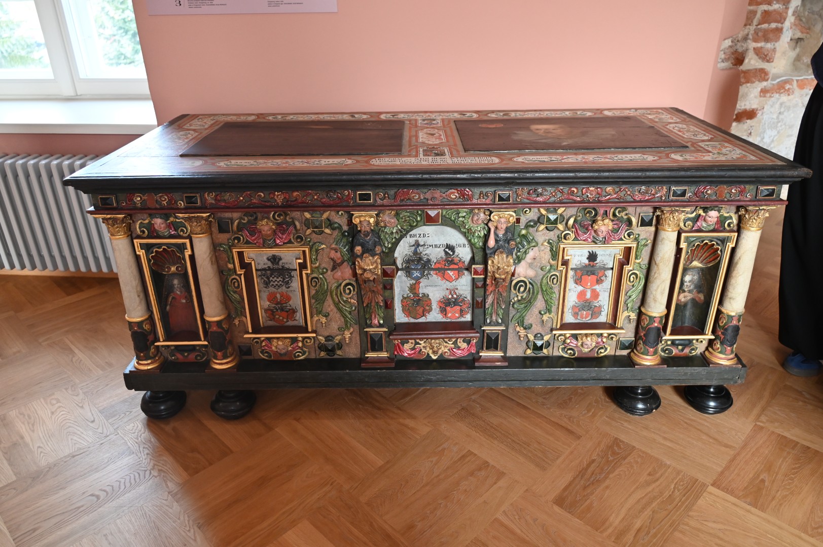 Następnie weszliśmy w krąg śmierci (wystawa: Luterańskie epitafia i portrety upamiętniające) i dłuższą chwilę spędziliśmy przed prawdopodobnie najcenniejszym eksponatem w kolekcji Muzeum Prus Górnych. Mowa o późnorenesansowym, namalowanym na desce sosnowej, epitafium wspomnianego Piotra zu Dohny i jego małżonki – Katarzyny z Czemów (von Zehmen). Obraz ten powstał w co najmniej dwóch fazach i wyszedł, jak się przypuszcza, spod pędzla Hansa Hennebergera z Królewca, syna słynnego uczonego i kartografa. Początkowo przedstawiał tylko Piotra i Katarzynę (ok. 1550 roku), później – ok. 1600 roku – został uzupełniony do sceny wielopostaciowej z ich ośmioma synami i córką oraz wzbogacony kompozycją zaczerpniętą z grafiki Albrechta Dürera z 1511 roku – sceną Trójcy Świętej. Którą to scenę zamalowano w 1624 roku, a ukazała się dopiero po renowacji w Słobitach.