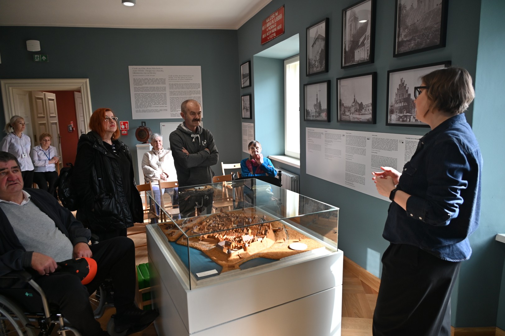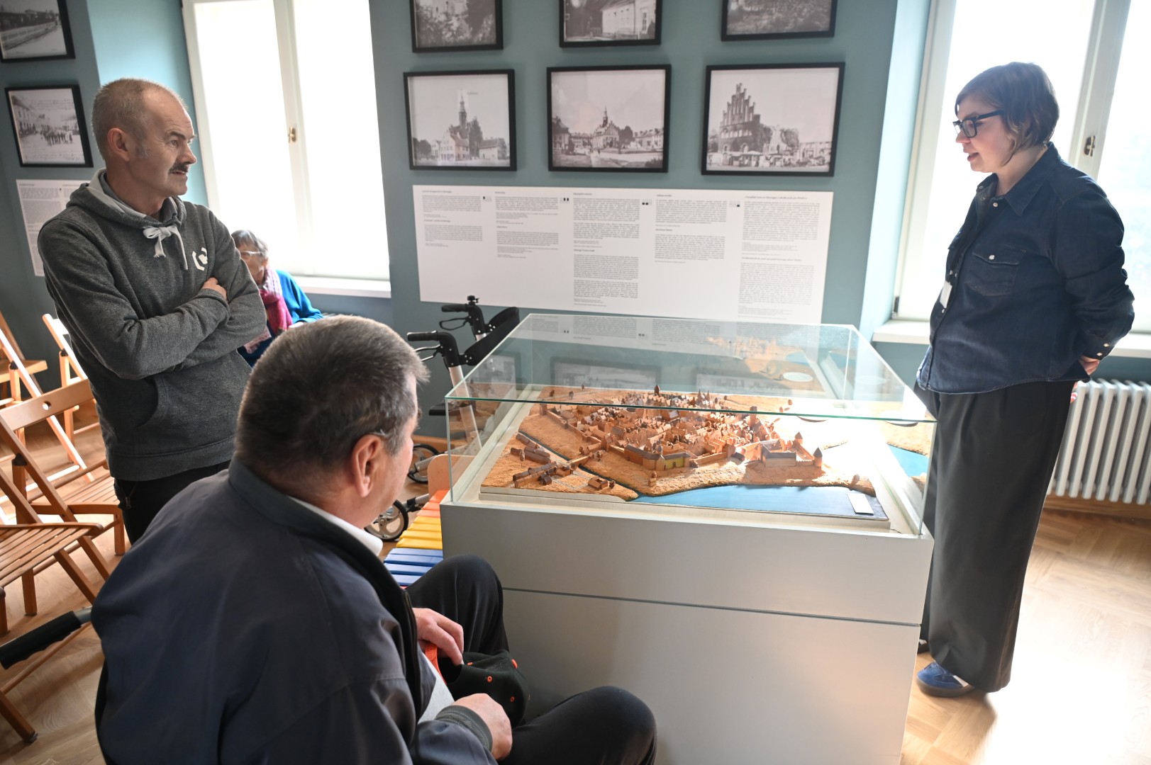 Na początek elokwentna przewodniczka zaprowadziła nas do pomieszczenia prezentującego dzieje miasta zwanego przez wieki Mohrungen (wystawa: Przestrzeń Morąga i okolic). Obejrzeliśmy tam stare mapy oberlandzkiej krainy autorstwa Kaspara Hennebergera i Johanna Baptisty Homanna, archiwalne zdjęcia prezentujące wnętrza urbanistyczne i architekturę oraz przede wszystkim makietę Morąga z końca doby nowożytnej – miasta okolonego murami obronnymi i ocembrowaną fosą, ze szczelnie zabudowanym rynkiem i przyrynkowymi kwartałami, ratuszem z doklejonymi doń budami, farą, zamkiem krzyżackim i wspominanym już Zameczkiem. Przypomniały nam się wtedy słowa pastora J. Ch. Wedeke, oglądającego taki właśnie Morąg, pod koniec XVIII stulecia i piszącego tak: