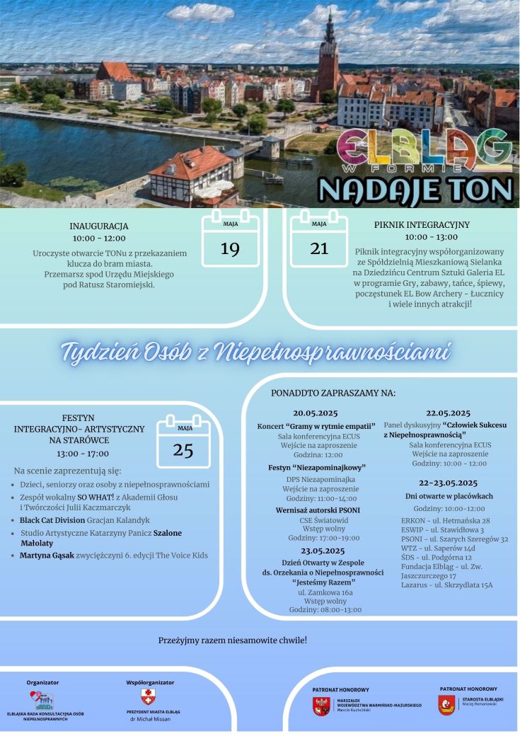 W najbliższy poniedziałek 19 maja rozpoczyna się Tydzień Osób z Niepełnosprawnościami, który rokrocznie organizuje Stowarzyszenie "Elbląska Rada Konsultacyjna Osób Niepełnosprawnych". Wydarzenie objął patronatem honorowym Starosta Elbląski Maciej Romanowski. W ramach uroczystości, podczas których odbywa się cykl spotkań warsztatowo-integracyjnych (pikniki, występy artystyczne, konferencje, prezentacja placówek działających na rzecz osób z niepełnosprawnościami i ich rodzin), ambasadorzy zajmują się propagowaniem niwelowania barier społecznych osób z niepełnosprawnościami z pozostałymi mieszkańcami miasta i regionu oraz propagowaniem wspólnych działań wyrównujących szanse we wszystkich dziedzinach zycia. Oprócz szeroko rozumianej pomocy, podczas wydarzenia będzie miała miejsce promocja zatrudnienia i aktywizacja osób z niepełnosprawnościami oraz bez pracy, aktywizacja i integracja społeczności lokalnej, ochrona i promocja zdrowia, propagowanie idei tolerancji i ochrony praw człowieka, budowanie społeczeństwa obywatelskiego, działalność z dziedziny edukacji, kultury i sportu, , wspieranie inicjatyw społecznych, edukacja obywatelska oraz promocja wolontariatu.