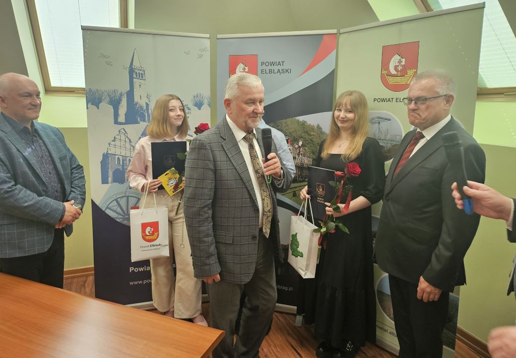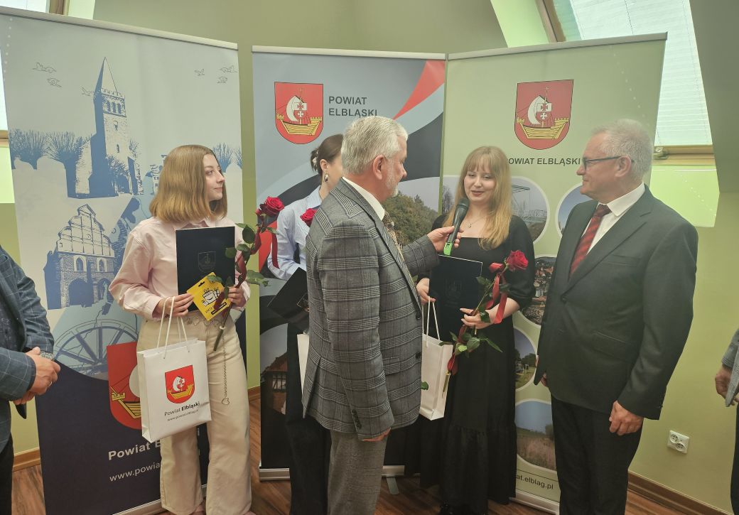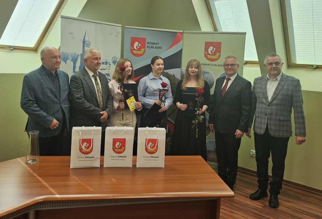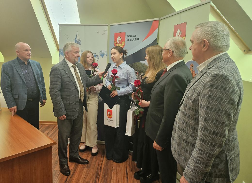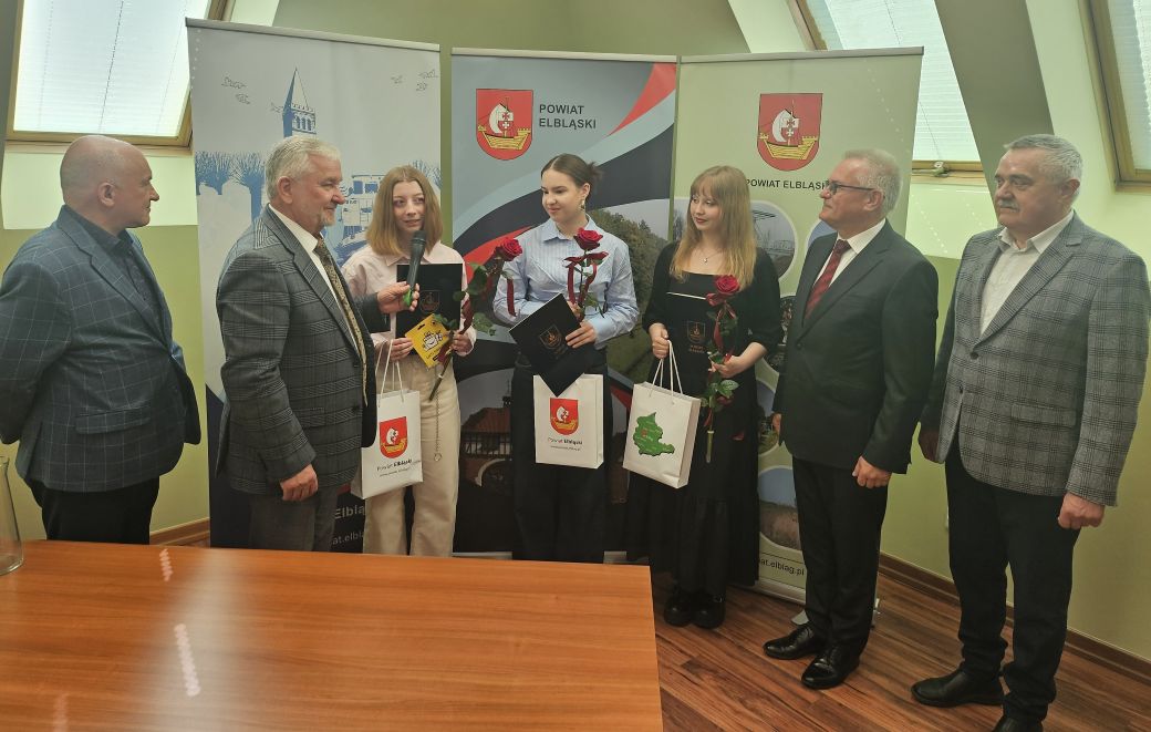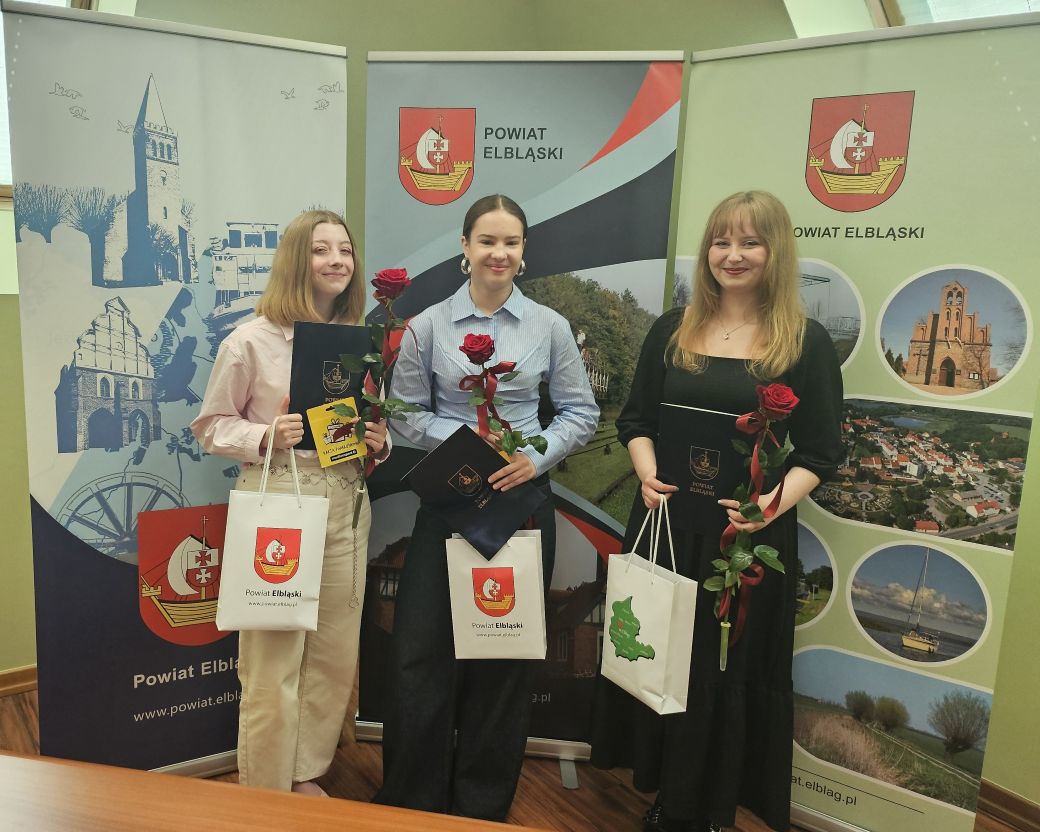 W dniu 27 maja 2025 r., podczas posiedzenia Zarządu Powiatu w Elblągu, Starosta Elbląski Maciej Romanowski wraz z Członkami Zarządu Powiatu w Elblągu p. Ryszardem Zającem, p. Jerzym Romanowskim oraz p. Jackiem Matukiewiczem wręczyli nagrody trzem uczennicom Liceum Sztuk Plastycznych w Gronowie Górnym, za zajęcie miejsc na podium w Konkursie plastycznym promującym Powiat Elbląski.