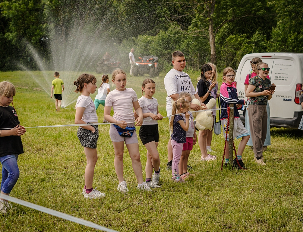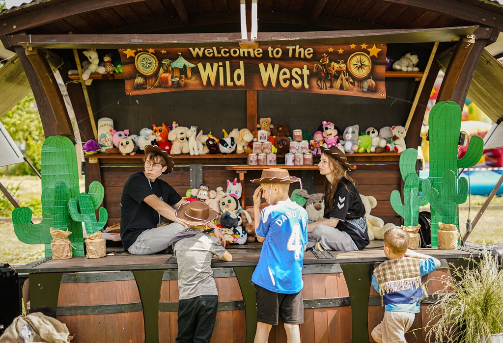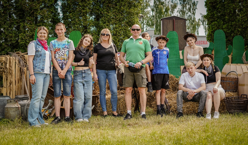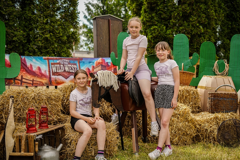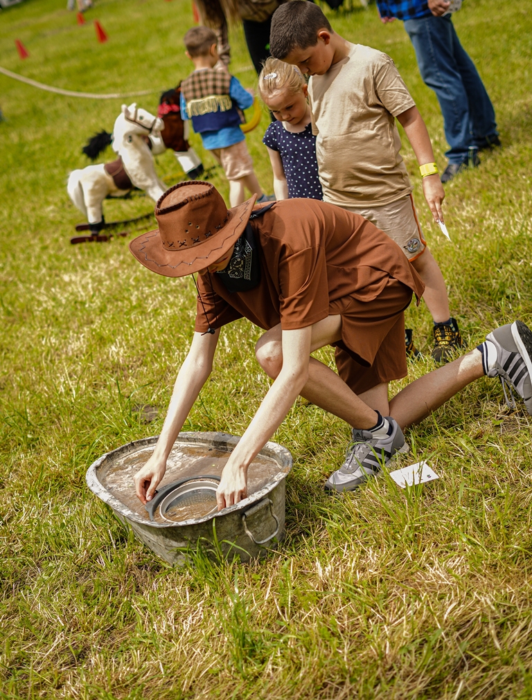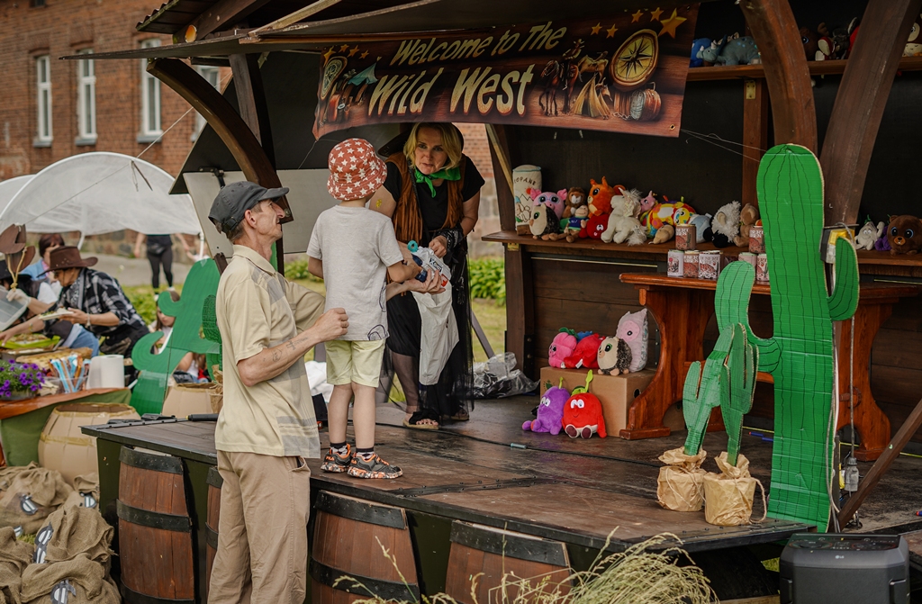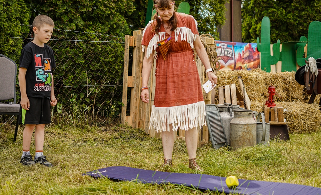 a na najbardziej wytrwałych po przejściu wszystkich zadań czekała nagroda. Oprócz wymienionych konkurencji (przeciąganie liny, rzut podkową, poszukiwacze złota, wyścig hobby horse, kostki z zadaniami, rzut lassem) była okazja by zjeść przepyszne mięso z grilla, kowbojską grochówkę, słodkie pyszności, a wszystko zagryźć owocami i zapić pyszną lemoniadą i prawdziwym domowym kompotem z rabarbaru. Warto wspomnieć również o wacie cukrowej i pop-cornie. Jednak to nie wszystko, można było porozmawiać z policjantami, sfotografować się na motocyklu policyjnym, odwiedzić stoisko przygotowane przez Straż Graniczną, postrzelać z paint balla, pojeździć wozem strażackim oraz nauczyć się resuscytacji. Absolutnym topem były możliwości przejażdżki pełnokrwistymi quadami 4x4 oraz w siodle prawdziwych koni. Nieco mniej adrenaliny potrzebne było do tego, aby pozjeżdżać z olbrzymich dmuchanych zamków, czy też do zrobienia sobie zdjęcia na ściance tematycznej w siodle „prawie” prawdziwego mustanga. Ponadto w autentycznej westernowej przyczepie można było postrzelać do puszek i wygrać wymarzonego pluszaka. Malowanie buziek, kolorowe warkoczyki, figurki z balonów, tatuaże i bańki mydlane również zagościły u nas w tym miłym dniu.