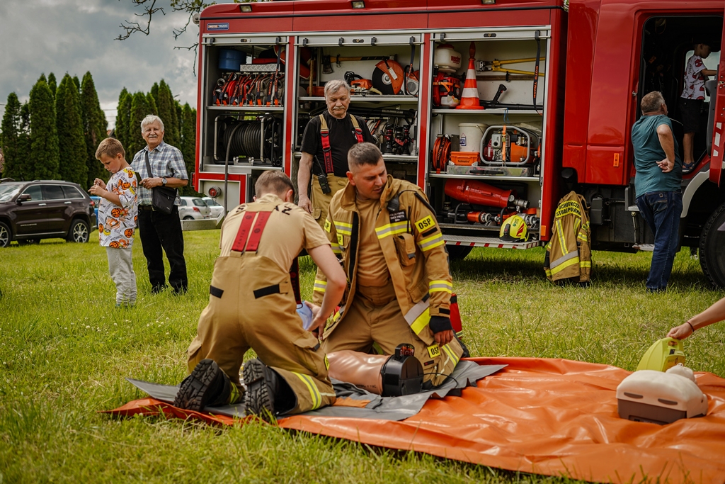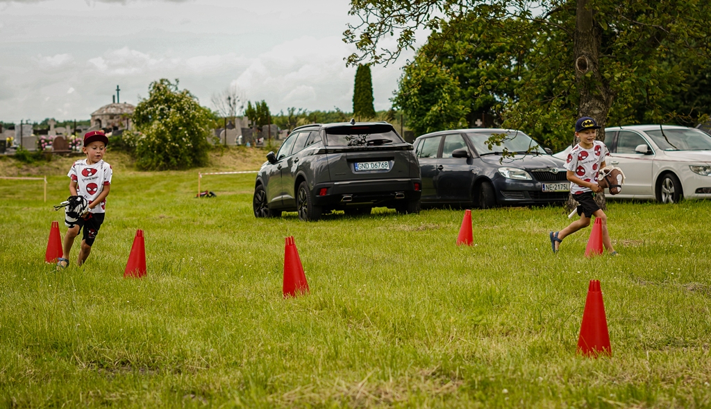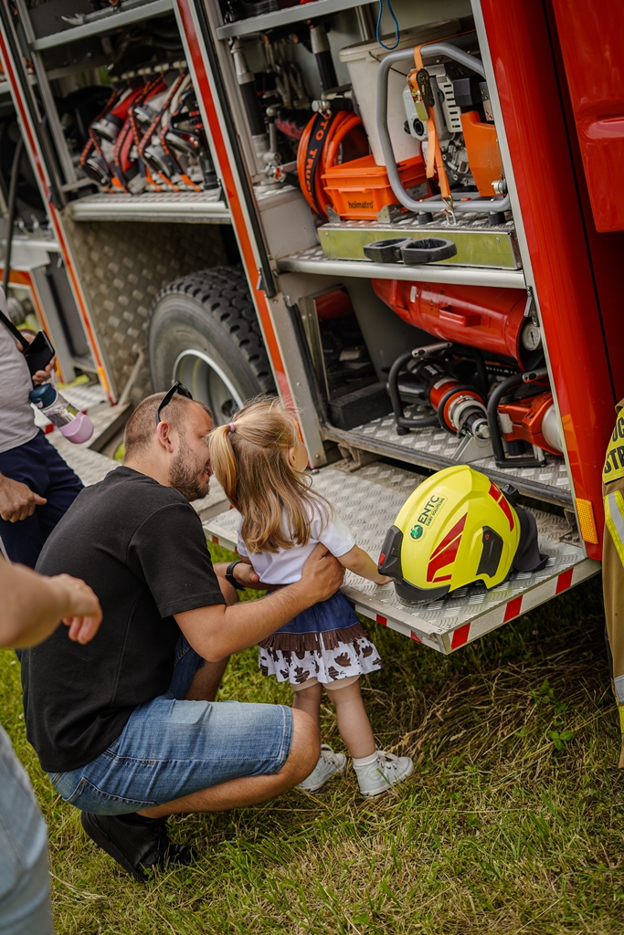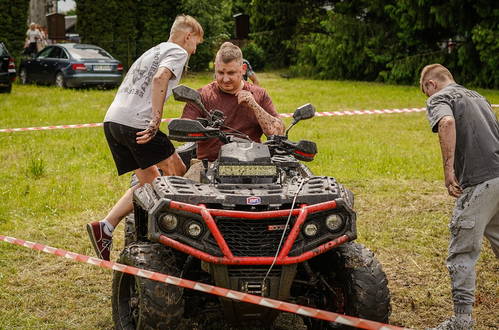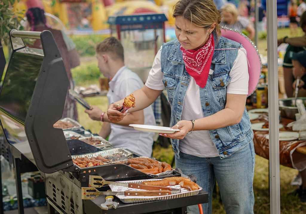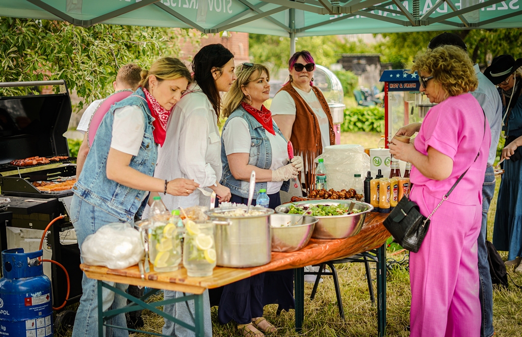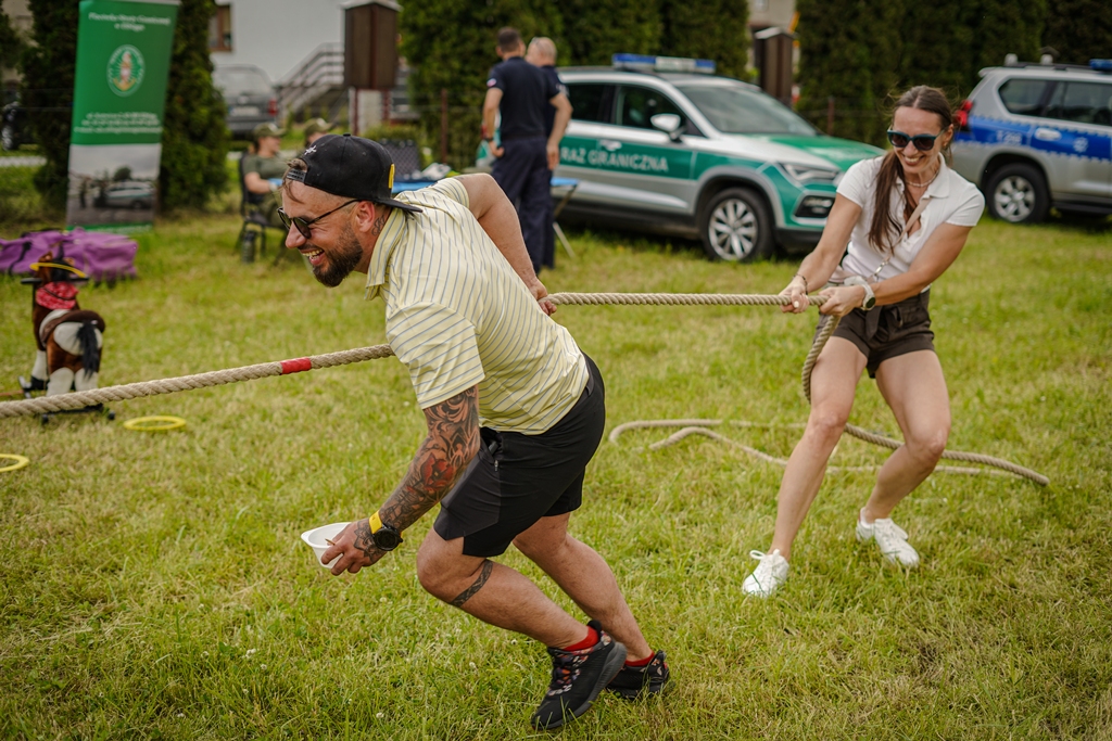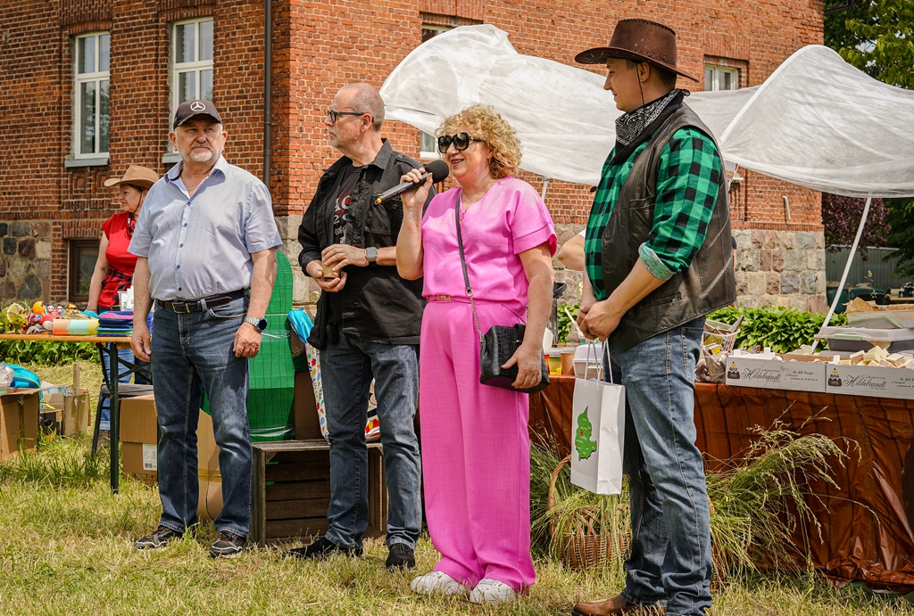a na najbardziej wytrwałych po przejściu wszystkich zadań czekała nagroda. Oprócz wymienionych konkurencji (przeciąganie liny, rzut podkową, poszukiwacze złota, wyścig hobby horse, kostki z zadaniami, rzut lassem) była okazja by zjeść przepyszne mięso z grilla, kowbojską grochówkę, słodkie pyszności, a wszystko zagryźć owocami i zapić pyszną lemoniadą i prawdziwym domowym kompotem z rabarbaru. Warto wspomnieć również o wacie cukrowej i pop-cornie. Jednak to nie wszystko, można było porozmawiać z policjantami, sfotografować się na motocyklu policyjnym, odwiedzić stoisko przygotowane przez Straż Graniczną, postrzelać z paint balla, pojeździć wozem strażackim oraz nauczyć się resuscytacji. Absolutnym topem były możliwości przejażdżki pełnokrwistymi quadami 4x4 oraz w siodle prawdziwych koni. Nieco mniej adrenaliny potrzebne było do tego, aby pozjeżdżać z olbrzymich dmuchanych zamków, czy też do zrobienia sobie zdjęcia na ściance tematycznej w siodle „prawie” prawdziwego mustanga. Ponadto w autentycznej westernowej przyczepie można było postrzelać do puszek i wygrać wymarzonego pluszaka. Malowanie buziek, kolorowe warkoczyki, figurki z balonów, tatuaże i bańki mydlane również zagościły u nas w tym miłym dniu.
