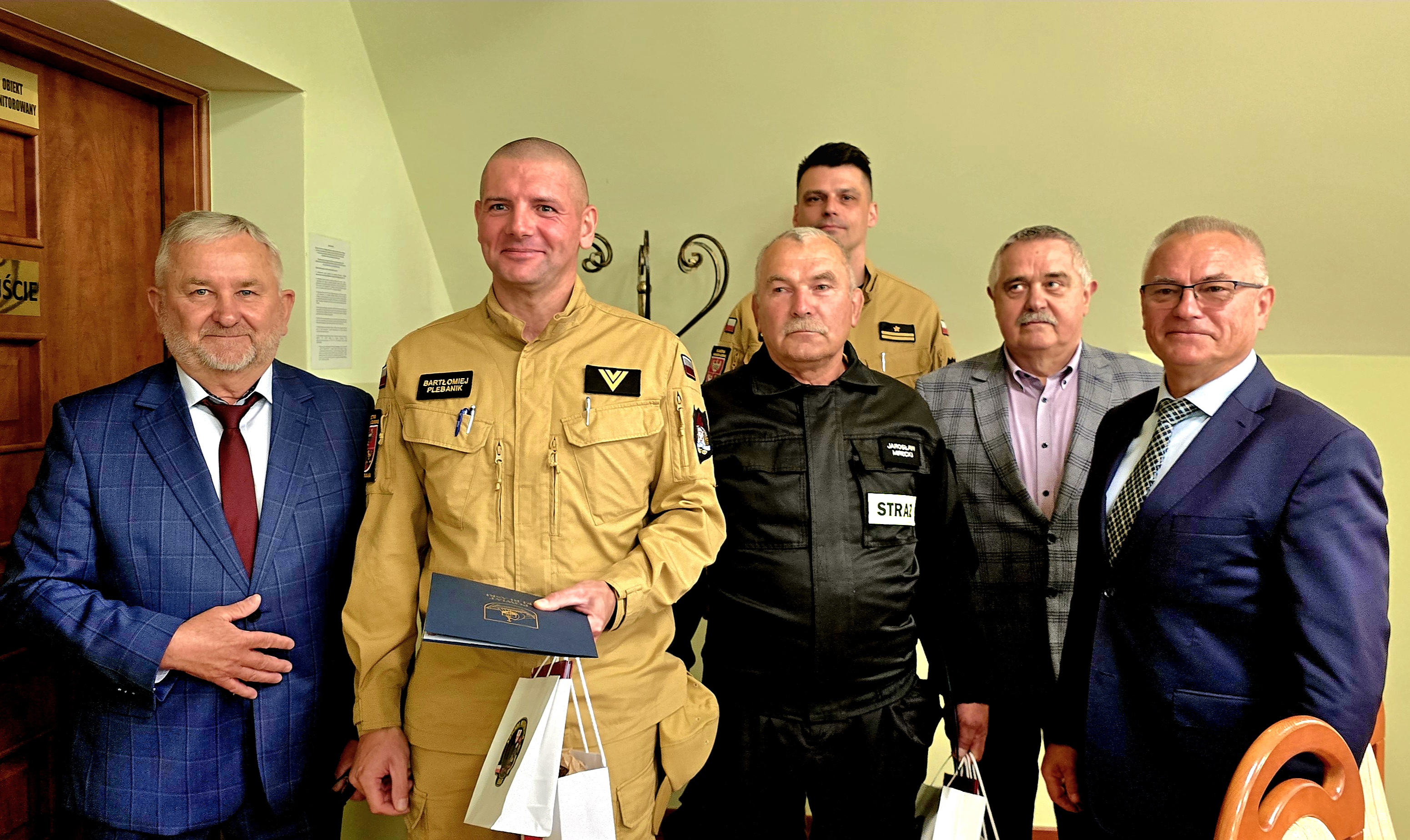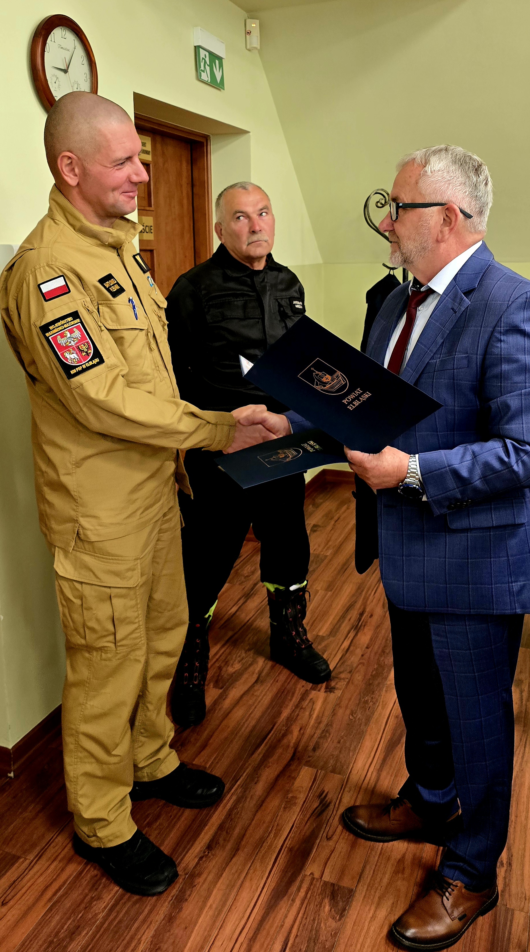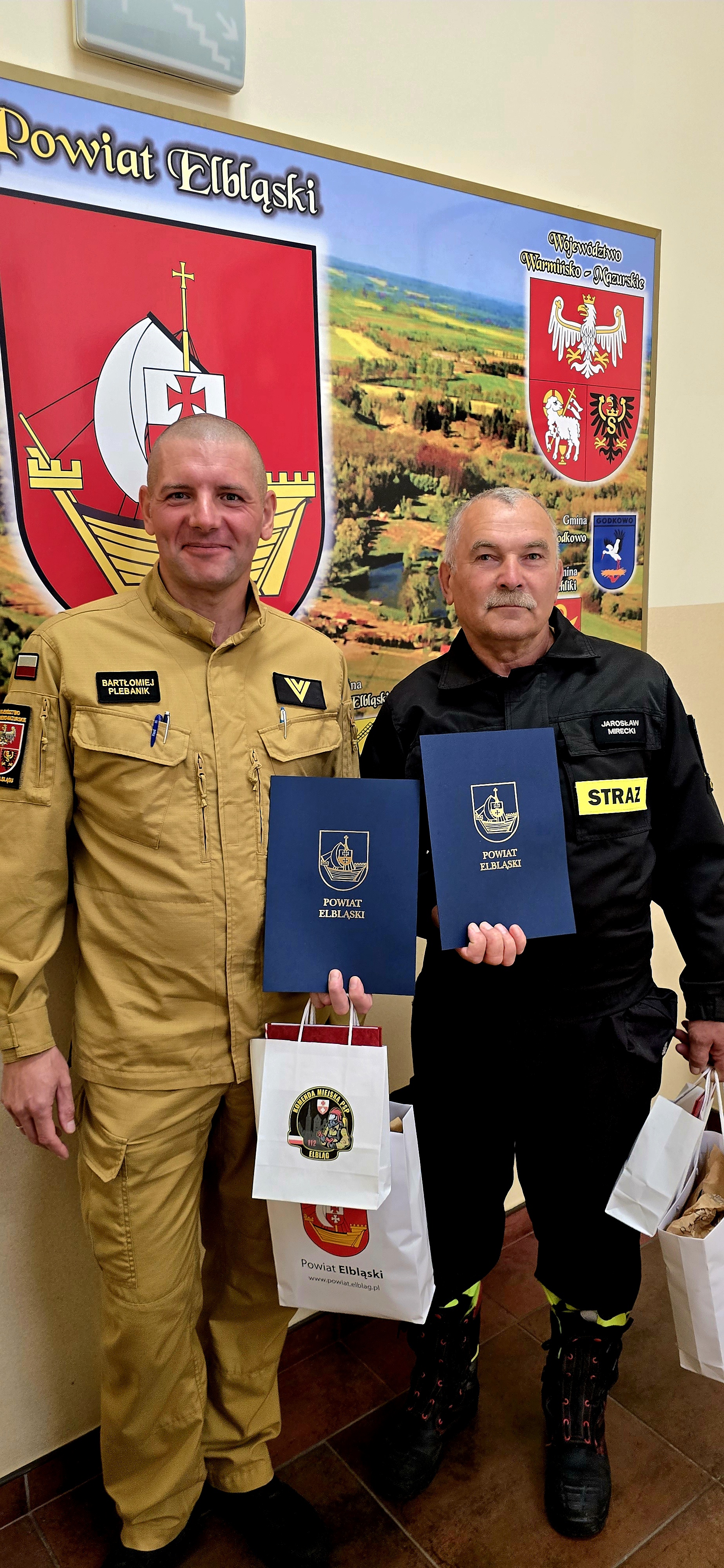 W dniu dzisiejszym podczas wspólnego posiedzenia Zarządu Powiatu w Elblągu, Komisji Bezpieczeństwa i Porządku Publicznego Starosty Elbląskiego oraz Komisji Bezpieczeństwa, Porządku Publicznego i Obronności Rady Powiatu w Elblągu przekazano st. ogn. Bartłomiejowi Plebanikowi z JRG 3 w Pasłęku oraz druhowi Jarosławowi Mireckiemu z OSP Markusy najserdeczniejsze gratulacje i uznanie za heroiczną postawę. Dnia 15 kwietnia br. obaj Panowie, przebywający tego dnia poza służbą, dzięki szybkiej reakcji, odwadze i zaangażowaniu, udzielili pomocy nieprzytomnemu mężczyźnie do czasu przybycia zespołu ratownictwa medycznego, co uratowało jego zdrowie i życie.