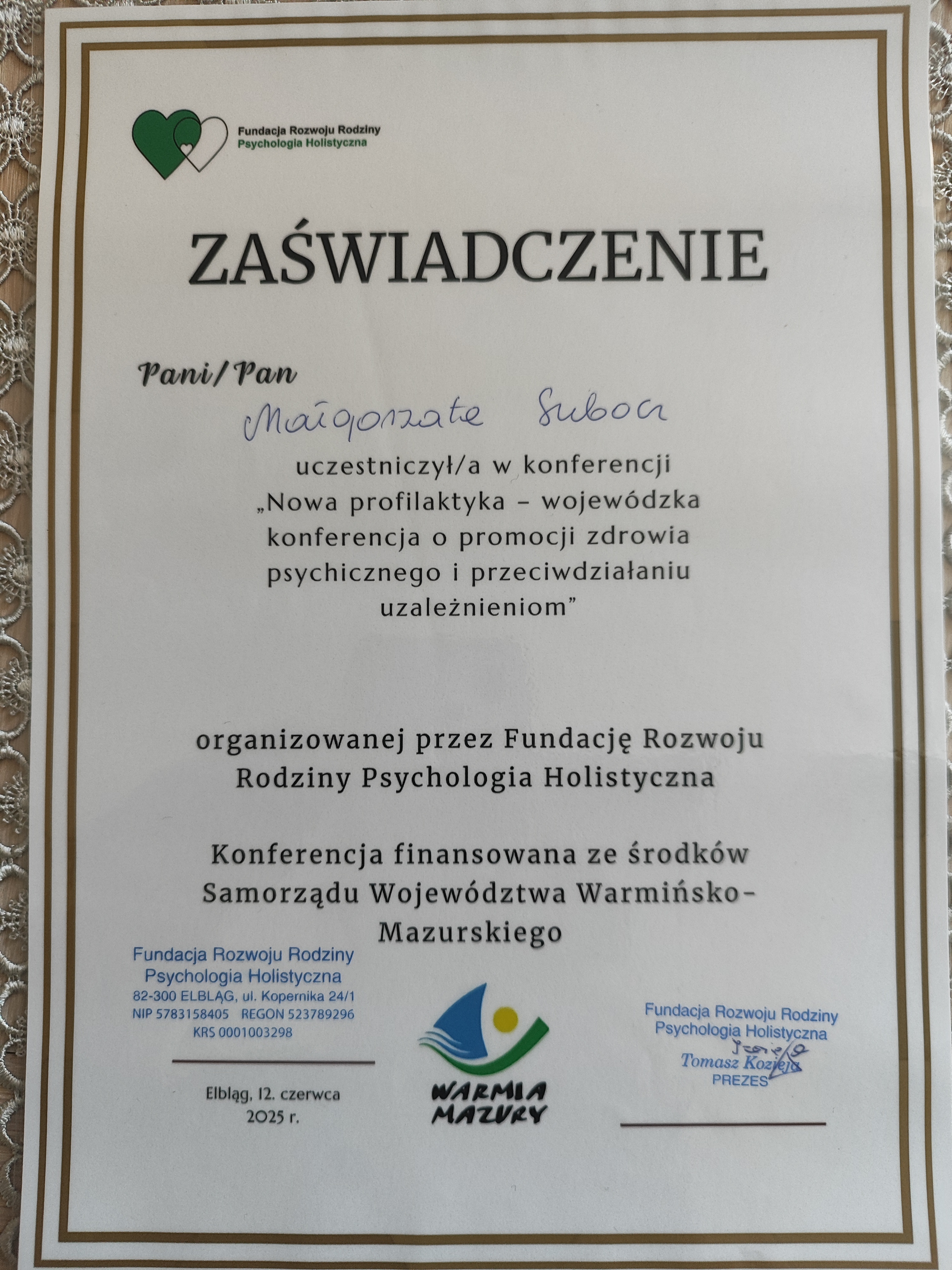 12 czerwca w Elblągu odbyła się wojewódzka konferencja pt.:„Nowa profilaktyka – promocja zdrowia psychicznego i przeciwdziałanie uzależnieniom”, zorganizowana przez Fundację Rozwoju Rodziny, Pracownię Psychologii Holistycznej oraz partnerów. Kierownik Środowiskowego Domu Samopomocy w Przezmarku p .Małgorzata Subocz miała zaszczyt i przyjemność uczestniczyć w wydarzeniu, które odbyło się w Auli Akademii Nauk Stosowanych przy Al. Grunwaldzkiej w Elblągu. Konferencja odbyła się pod hasłem „Rozbite światy – jak przeciwdziałać skutkom rozwodów i uzależnień w życiu dzieci i młodzieży”.