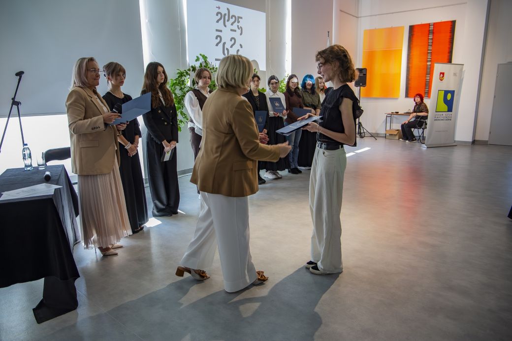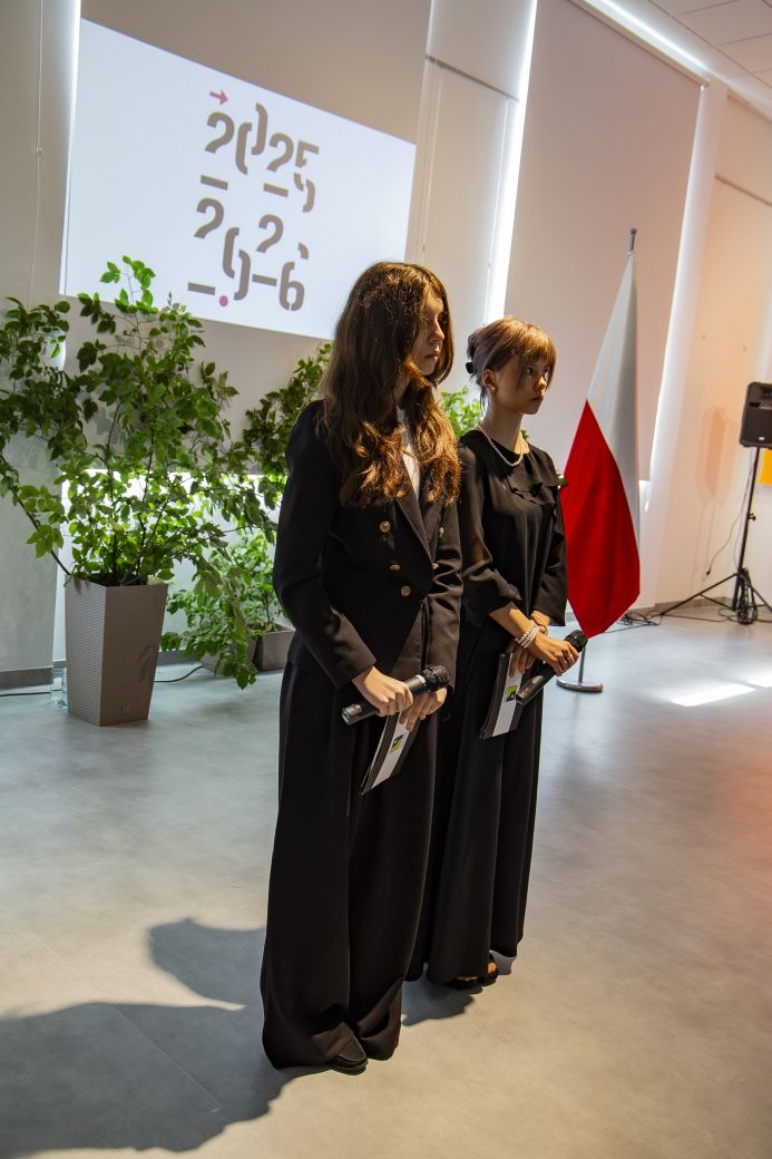 Wrzesień to jednak nie tylko początek roku szkolnego. To także czas pamięci. W 86 rocznicę wybuchu II wojny światowej uczniowie, nauczyciele i zaproszeni goście oddali hołd wszystkim, którzy walczyli o wolność i życie w pokoju. Cała sala w skupieniu uczciła ich pamięć minutą ciszy - momentem pełnym wzruszenia i refleksji. Kolejnym punktem uroczystości było przemówienie Pani Dyrektor, w którym podkreślono, że nowy rok szkolny to nie tylko kolejne wyzwania artystyczne, ale także praca nad sobą, relacjami i wrażliwością - wartościami równie ważnymi jak warsztat twórczy. Pani Dyrektor wręczyła wyróżnienia i nagrody (dotarły do szkoły podczas wakacji) uczennicom naszej szkoły, które w ubiegłym roku szkolnym osiągnęły szczególne sukcesy w konkursach artystycznych. Ta wyróżnienia były nie tylko uhonorowaniem pracy i talentu młodych twórczyń, ale także dowodem, że ich sztuka ma moc docierania daleko poza szkolne mury.