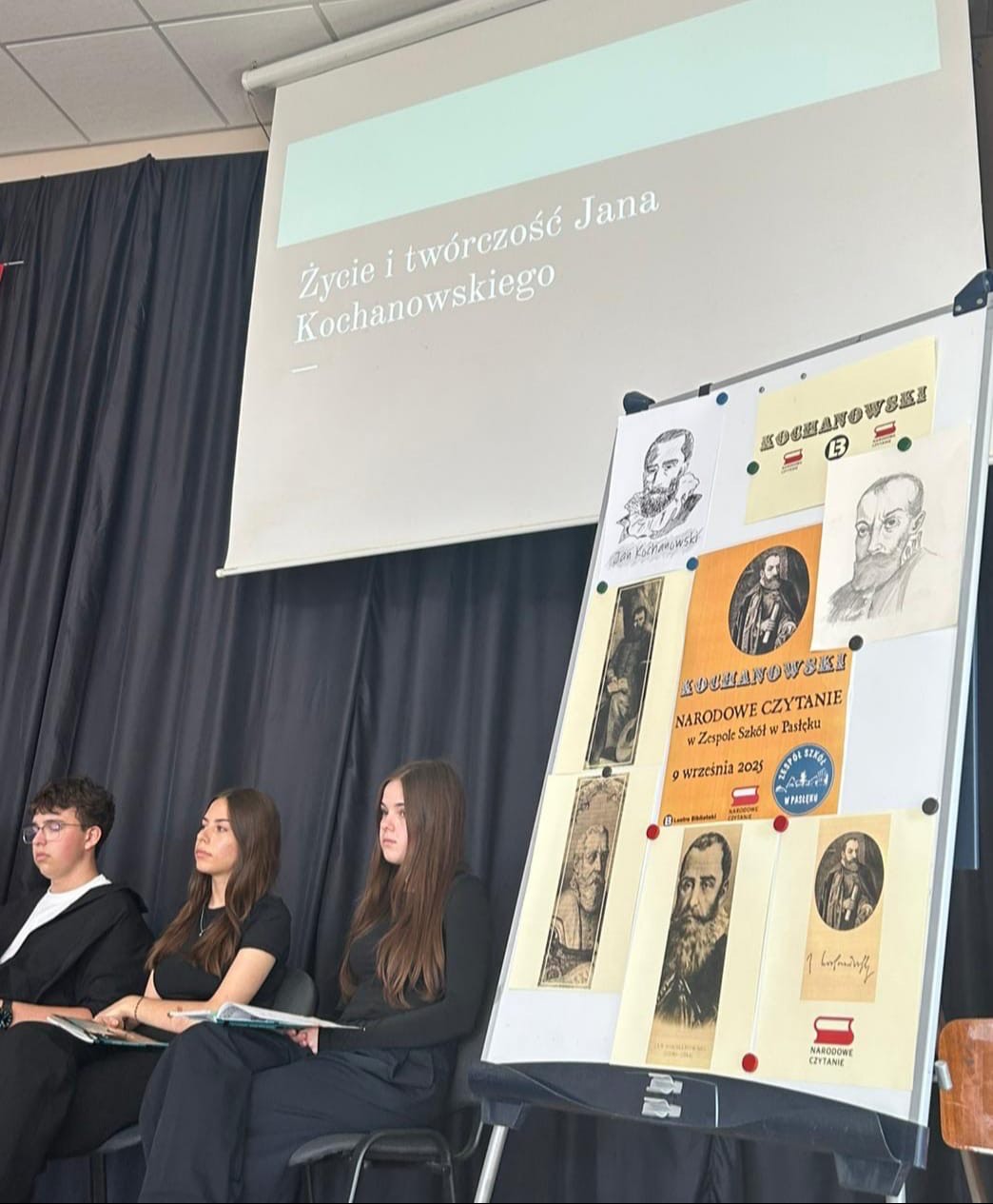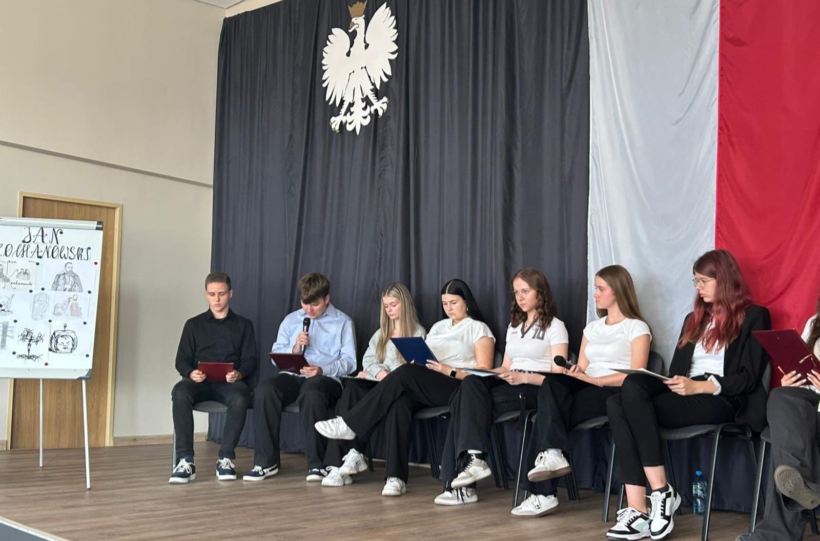 Tym razem wydarzenie poświęcone było twórczości Jana Kochanowskiego – jednego z najwybitniejszych poetów polskiego renesansu. Uczniowie wysłuchali fragmentów „Trenów”, „Pieśni”, „Odprawy posłów greckich” oraz „Fraszek”. Utwory te, mimo upływu wieków, wciąż zachwycają bogactwem języka i poruszają uniwersalne tematy ludzkich emocji, przemijania i refleksji nad życiem.