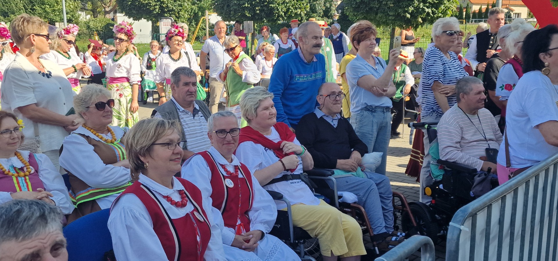 Mieszkańcy Domu Pomocy Społecznej w Tolkmicku tylko częściowo zanurzyli się w tej feerycznej atmosferze, albowiem wybraliśmy się na imprezę nieco później, przed 13-tą, gdyż naszym głównym celem było uczestnictwo w koncercie gwiazdy przeglądu – przesławnego i przesympatycznego Andrzeja Rybińskiego. Wmieszaliśmy się w barwnie przystrojony tłumek, zajęliśmy dogodne miejsca w cieniu i blisko sceny, a wkrótce doczekaliśmy się entrée naszego idola.