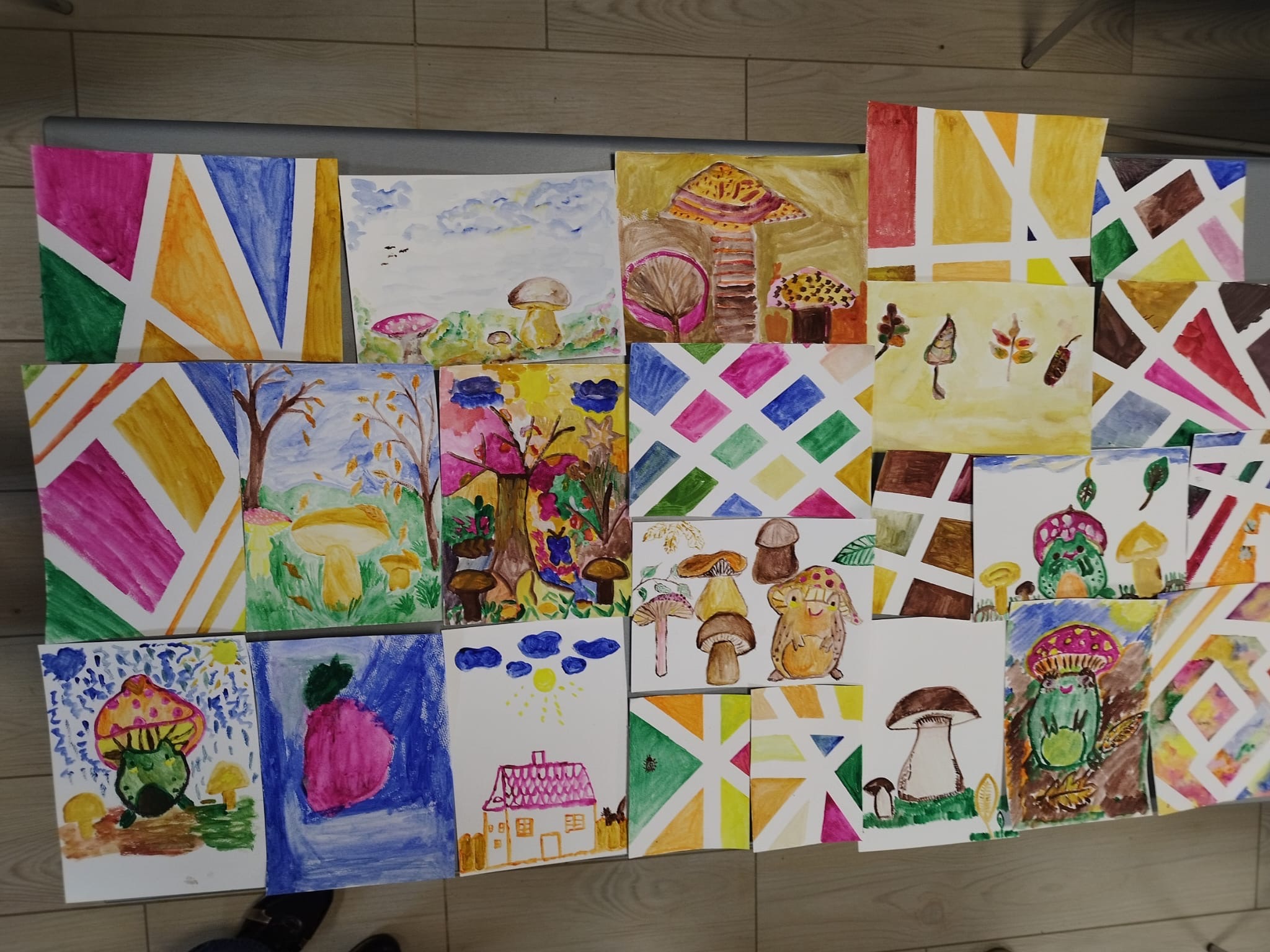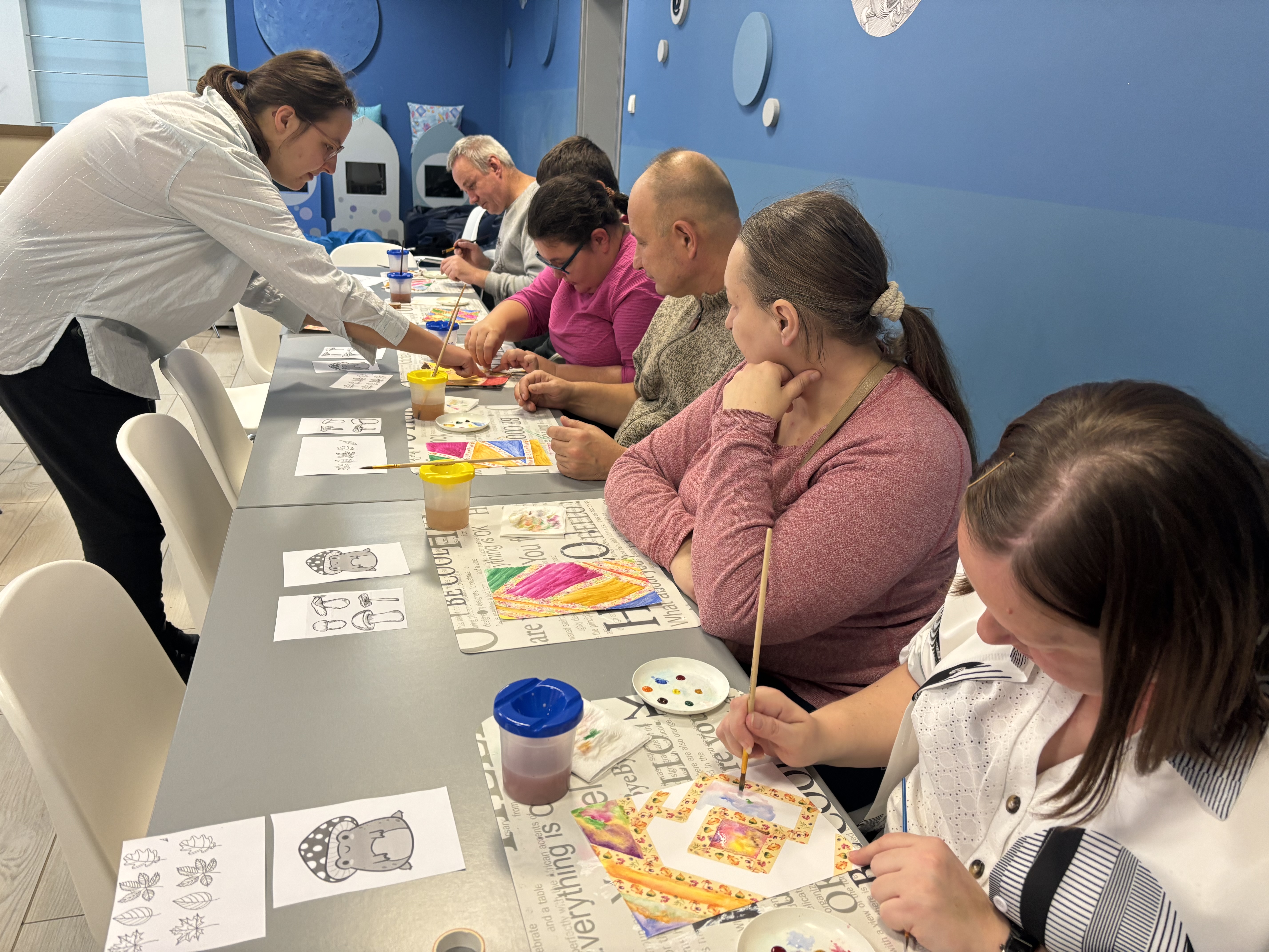 W trakcie zajęć powstały wyjątkowe prace przedstawiające jesienne pejzaże, liście oraz inne barwne motywy inspirowane tą porą roku. Uczestnicy z dużym zaangażowaniem oddali się twórczości – każdy z obrazów był wyjątkowy, pełen ciepłych tonów i indywidualnego spojrzenia na jesień. Atmosfera sprzyjała zarówno skupieniu, jak i swobodnej ekspresji artystycznej, tworząc przestrzeń, w której kreatywność mogła swobodnie rozkwitnąć.
