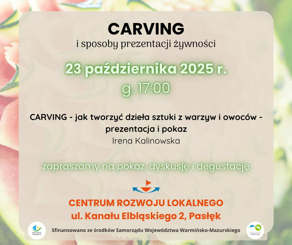 Już 23 października 2025 r. (czwartek) o godz. 17:00 odbędzie się wyjątkowe spotkanie z pokazem carvingu, podczas którego dowiemy się, jak z warzyw i owoców tworzyć prawdziwe dzieła sztuki!