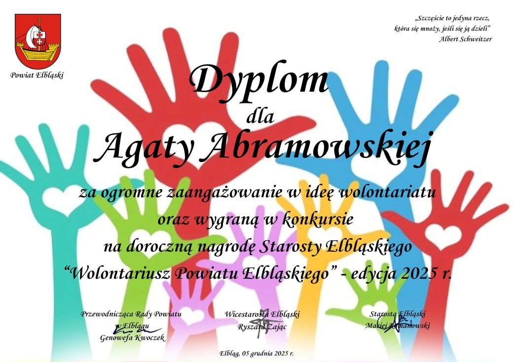 Agata Abramowska od wielu lat aktywnie angażuje się w działalność społeczną i charytatywną na terenie Powiatu Elbląskiego. Z ogromnym oddaniem wspiera osoby potrzebujące, seniorów i rodziny w trudnej sytuacji, łącząc działania lokalne z inicjatywami o zasięgu regionalnym