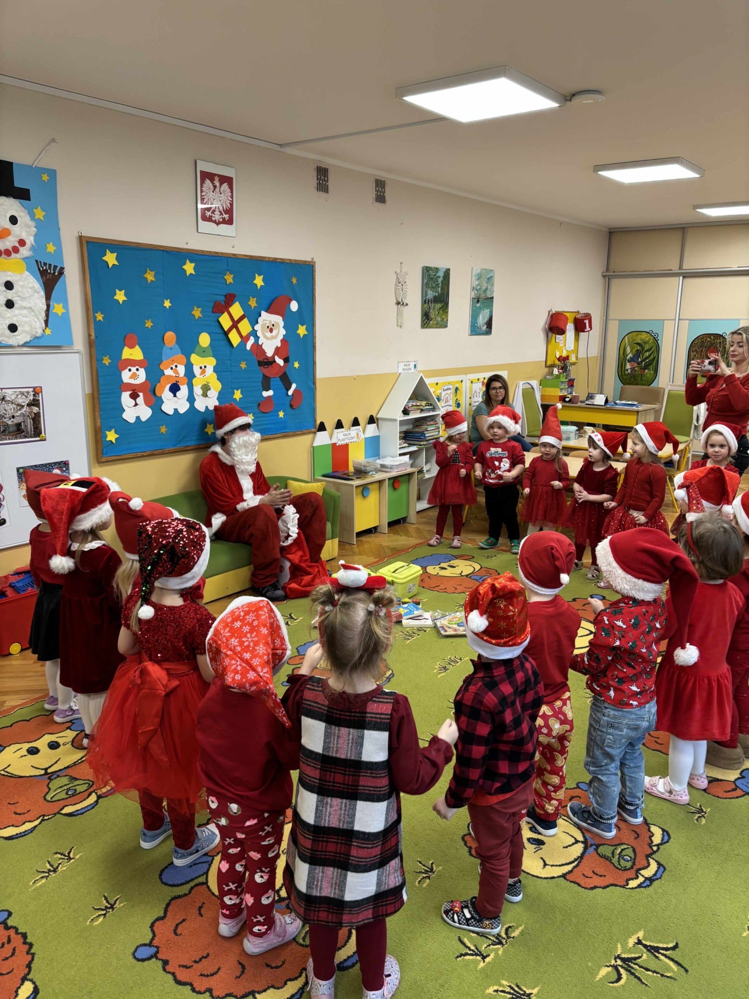 Przedszkolaki z dużym entuzjazmem uczestniczyły w zabawach i konkurencjach. Jednym z najbardziej wyczekiwanych momentów było wspólne czytanie opowieści o Świętym Mikołaju, które spotkało się z ogromnym zainteresowaniem maluchów.