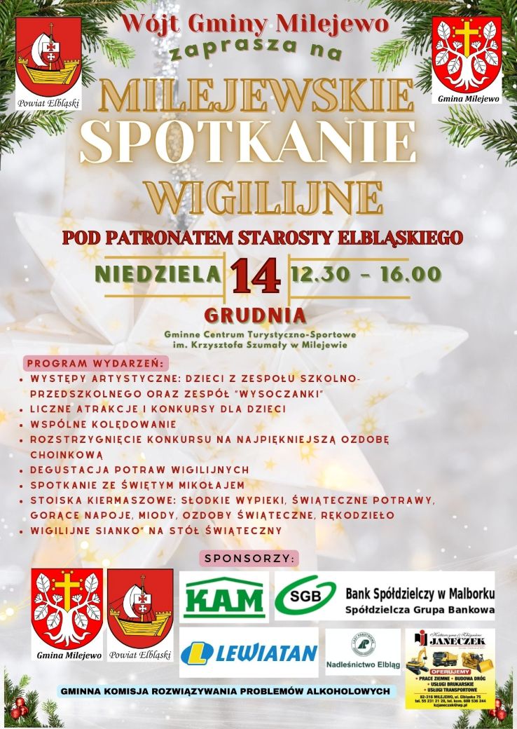 W dniu 14 grudnia 2025 r. odbyło się „Milejewskie Spotkanie Wigilijne”. Była to druga edycja tego typu bożonarodzeniowego wydarzenia kulturalnego, skierowanego do mieszkańców Gminy Milejewo, połączonego z prezentacją stoisk lokalnych stowarzyszeń, Kół Gospodyń Wiejskich oraz sołectw.