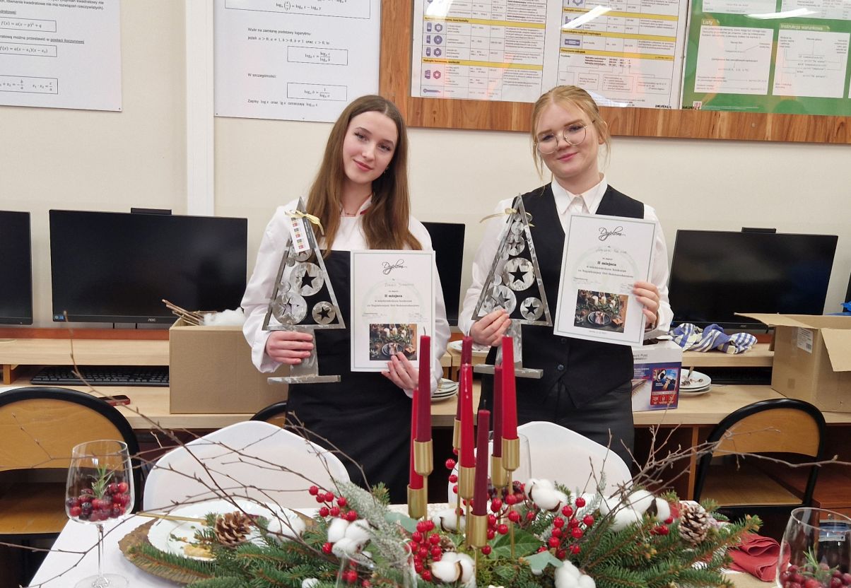 Uczennice Zespołu Szkół Ekonomicznych i Technicznych w Pasłęku – Dominika Juchniewicz oraz Angelika Felska z klasy 3 technik żywienia i usług gastronomicznych – odniosły kolejny kulinarny sukces, zdobywając drugie miejsce w IV edycji konkursu na „Najpiękniejszy Stół Bożonarodzeniowy”.