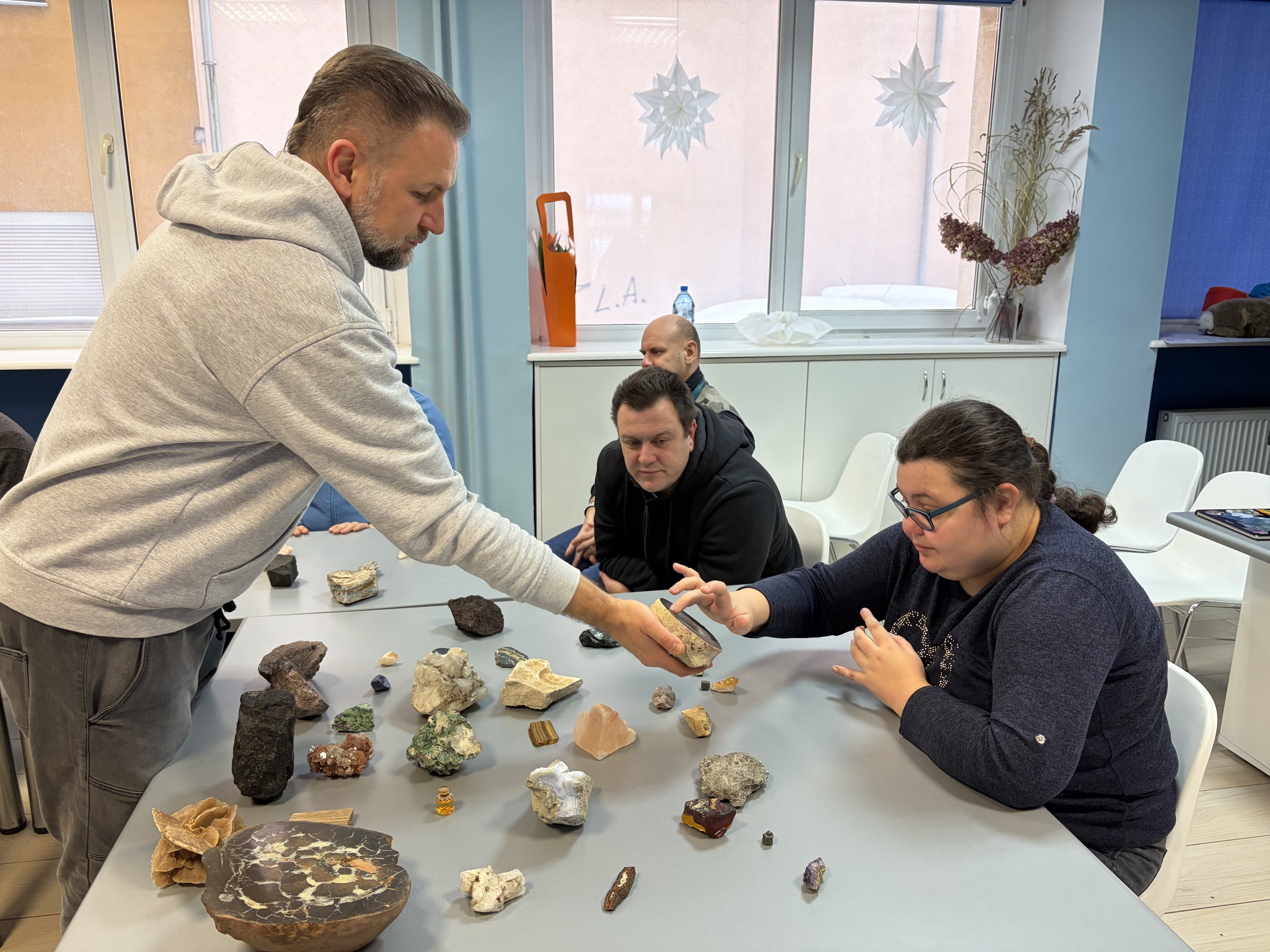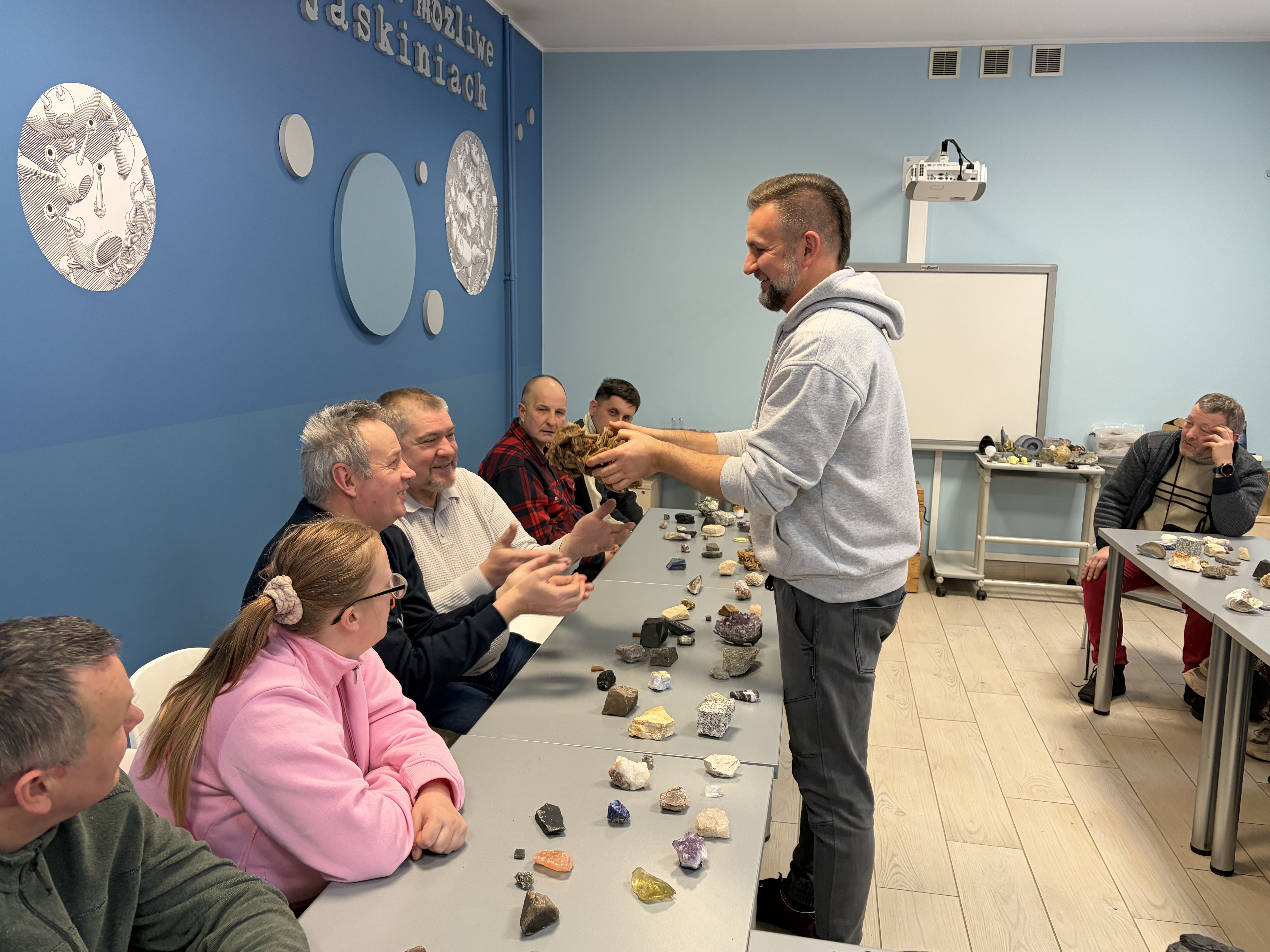 W dniu 12 stycznia 2026 roku uczestnicy Warsztatu Terapii Zajęciowej przy DPS „Krokus” we Władysławowie wzięli udział w spotkaniu edukacyjnym, które odbyło się w Bibliotece Elbląskiej – Filii nr 7 „Cyberiada”. Zajęcia miały formę prelekcji na temat skał i minerałów, a poprowadził je kierownik biblioteki Mateusz Paradowski, z wykształcenia nauczyciel geografii.