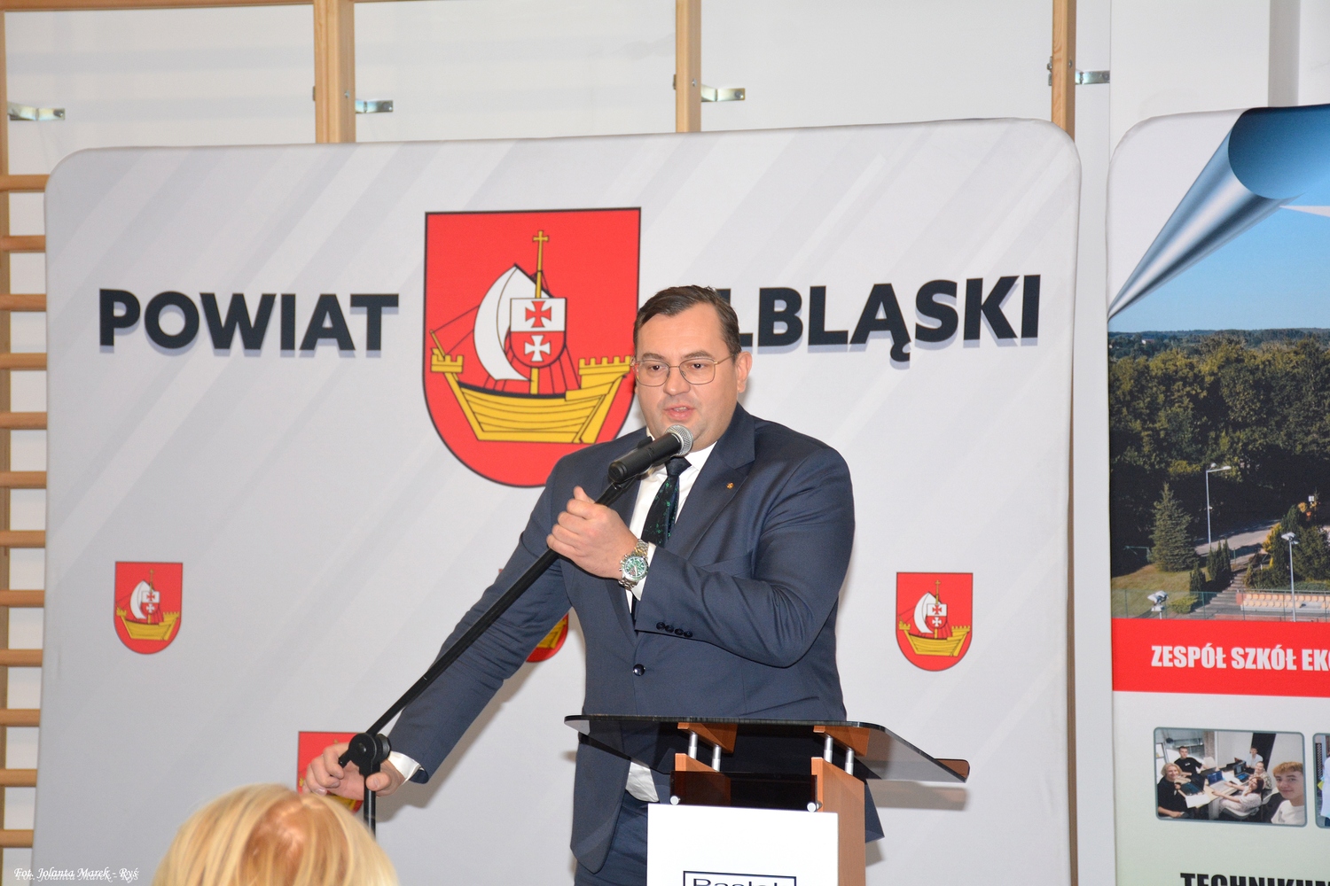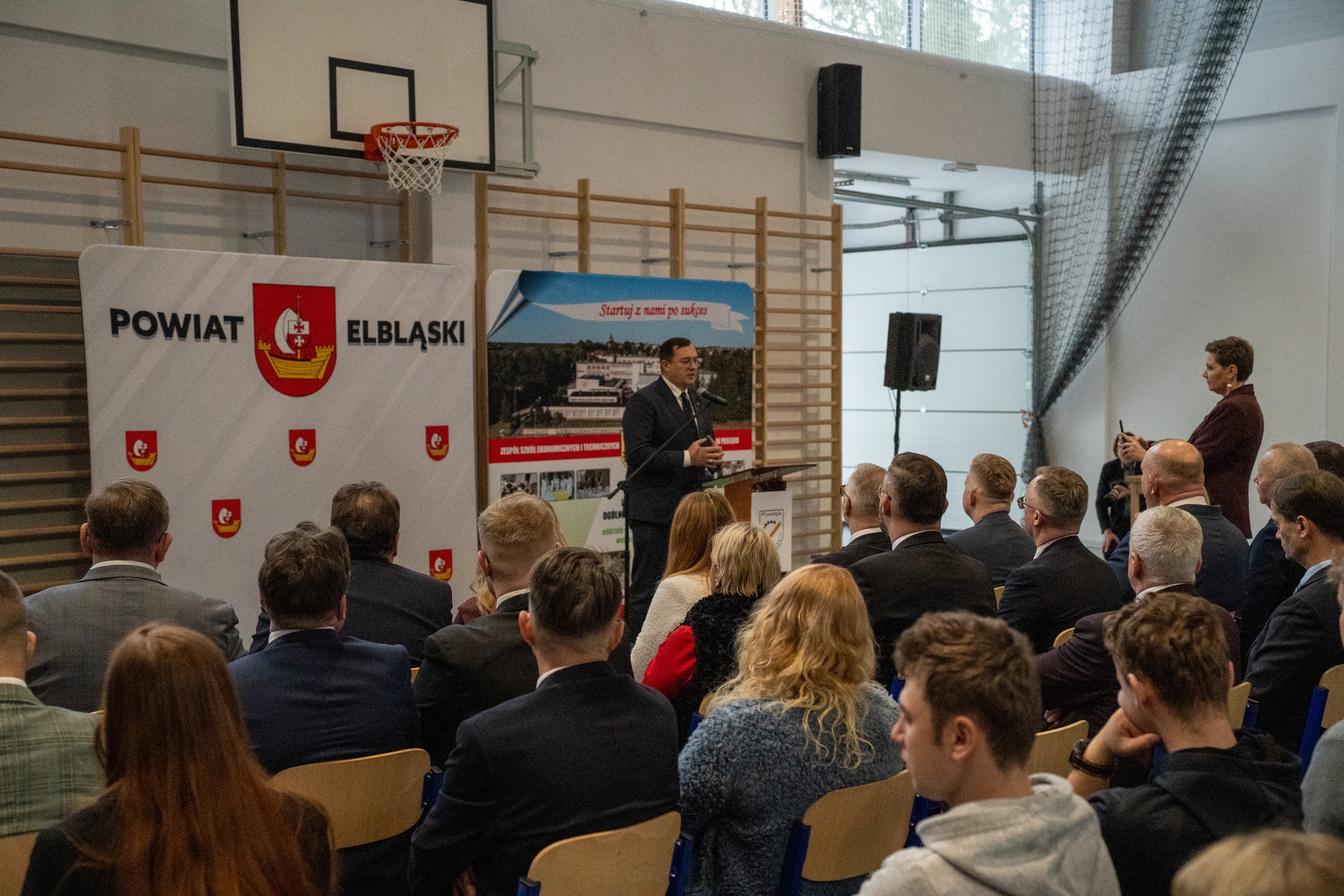 Wicedyrektor szkoły przedstawiła informacje dotyczące planowanego wprowadzenia od przyszłego roku szkolnego w technikum agrobiznesu specjalizacji z zakresu rolnictwa precyzyjnego z obsługą dronów, podkreślając, że nowy kierunek ma odpowiadać na potrzeby współczesnego rolnictwa, w którym coraz większą rolę odgrywają innowacyjne technologie, automatyzacja procesów oraz rozwiązania sprzyjające precyzyjnemu wykorzystaniu zasobów. Starosta Elbląski Maciej Romanowski przywitał wszystkich szacownych gości, wyrażając podziękowania za przybycie i zainteresowanie rozwojem nowoczesnych kierunków kształcenia. Następnie głos zabrali Minister Rolnictwa i Rozwoju Wsi Stefan Krajewski oraz Sekretarz Stanu, Zastępca Szefa Kancelarii Prezesa Rady Ministrów – Jakub Stefaniak, kontynuując zagadnienie nowoczesnego rolnictwa, ze szczególnym uwzględnieniem wykorzystania nowych technologii oraz znaczenia odpowiedniego przygotowania zawodowego młodych ludzi. W dalszej części spotkania uczniowie technikum ekonomicznego i agrobiznesu zadawali Ministrowi pytania dotyczące edukacji rolniczej, kompetencji absolwentów szkół zawodowych, możliwości odbywania staży i praktyk oraz perspektyw rozwoju zawodowego młodych ludzi planujących przyszłość w sektorze rolnym.