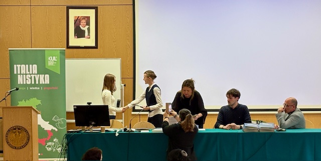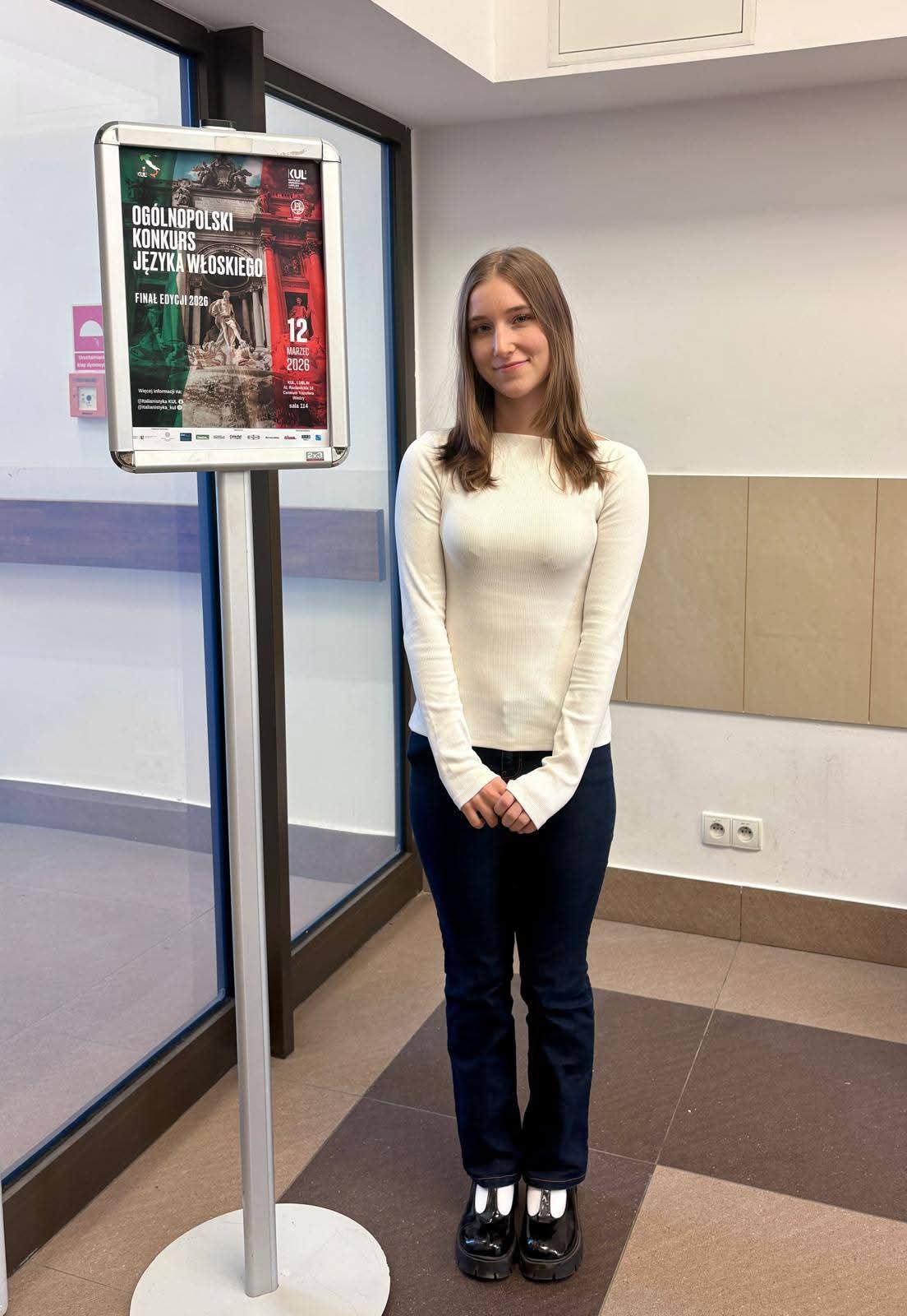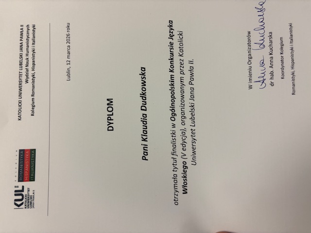 Z ogromną radością informujemy, że Klaudia Dudkowska z klasy 3b LO została finalistką Ogólnopolskiego Konkursu Języka Włoskiego organizowanego przez Katolicki Uniwersytet Lubelski, który odbył się 12.03.2026 r. w Lublinie. W etapie szkolnym wzięło udział 421 uczestników z całej Polski. Do etapu finałowego zakwalifikowało się 35 uczestników, którzy w ciągu dwugodzinnego testu sprawdzali swą wiedzę z zakresu gramatyki, leksyki oraz wiedzy o kulturze Włoch. Klaudia poradziła sobie świetnie, czego uwieńczeniem jest tytuł finalistki Konkursu.