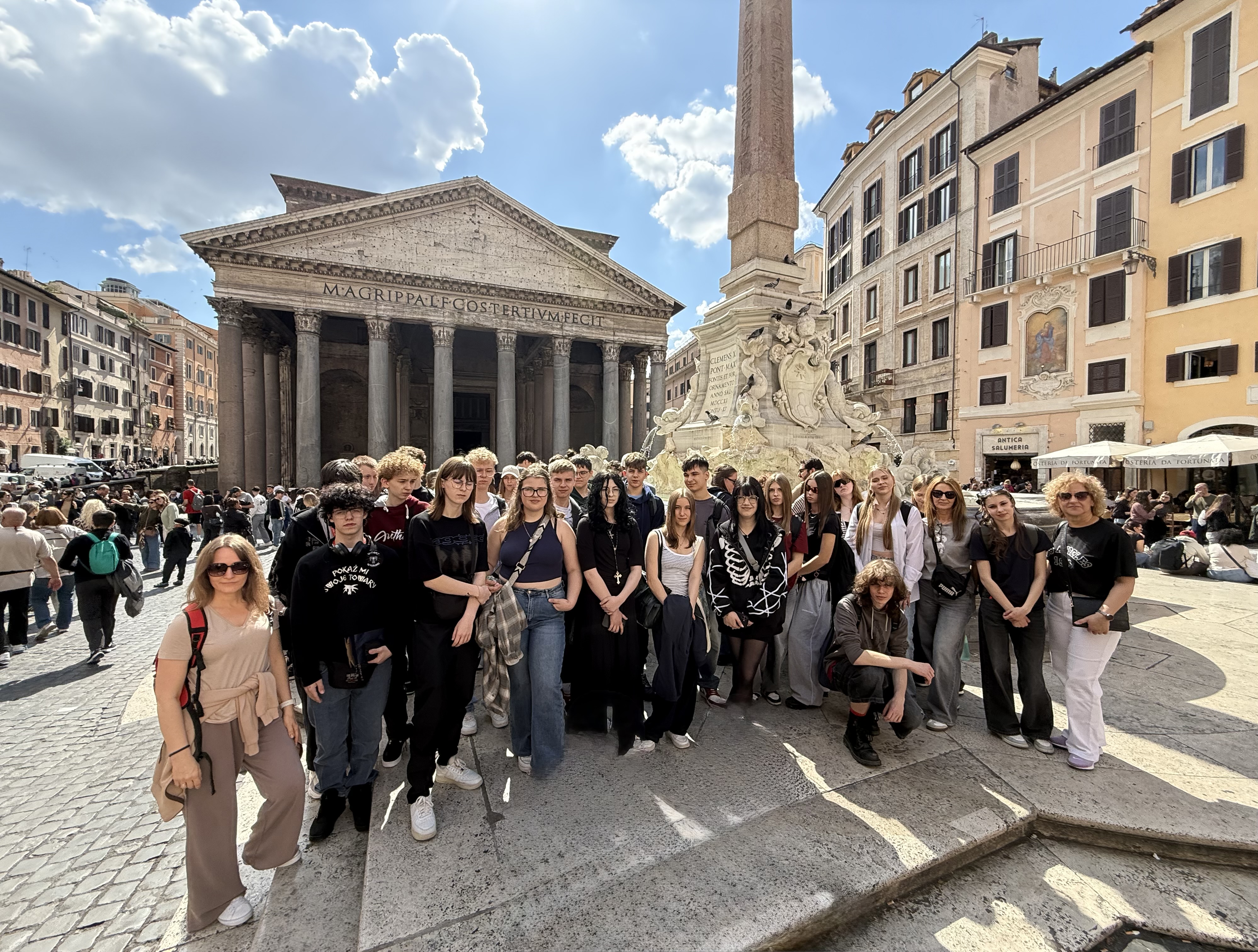 W dniach 15–20 marca grupa 36 uczniów Zespołu Szkół wybrała się na wycieczkę do Rzymu. W przepięknej stolicy Włoch uczniowie spędzili trzy pełne dni, które były wypełnione zwiedzaniem i odkrywaniem miasta. Już pierwszego dnia, we wtorek, rozpoczęli intensywny spacer z pilotem wycieczki – Michał Kiełbasa - Podróże znanym podróżnikiem i influencerem, który już kolejny raz towarzyszy szkole w zagranicznych wyjazdach. Podczas pobytu w wiecznym mieście uczniowie zobaczyli wiele najważniejszych miejsc. Odwiedzili m.in. Panteon, Piazza Navona z pięknymi fontannami (Fontanna del Moro, Fontanna Neptuna i Fontanna Czterech Rzek) oraz kościół Sant’Agnese in Agone. Spacerowali po Moście Świętego Anioła i podziwiali Zamek Świętego Anioła. Nie zabrakło też wizyty na Piazza di Spagna ze słynnymi Schodami Hiszpańskimi, w Galerii Sciarra oraz w Parku Villa Borghese. Duże wrażenie zrobiła na nich Fontanna di Trevi – bez wątpienia jedno z najbardziej klimatycznych i romantycznych miejsc w Rzymie. Młodzież odwiedziła również Koloseum – najsłynniejszy amfiteatr starożytnego Rzymu, a także Forum Romanum i Wzgórze Palatyńskie, gdzie mogli poczuć prawdziwy klimat antycznego miasta. Jednym z najważniejszych punktów programu była wizyta w Watykanie. Uczniowie zwiedzili Muzea Watykańskie oraz Kaplicę Sykstyńską, a także Bazylikę św. Piotra i Plac św. Piotra. Podczas zwiedzania uczestnikom wyjazdu towarzyszył przewodnik, pan Jerzy Sawko, który w bardzo ciekawy i przystępny sposób opowiadał o historii i znaczeniu odwiedzanych miejsc. Choć podróż była długa, bo odbywała się autokarem, od samego początku przebiegała bardzo komfortowo i spokojnie. Duża w tym zasługa kierowców – pana Rafała i pana Wojtka- właściciela firmy Milsbus z Elbląga. Ich rozwaga, opanowanie, doświadczenie i poczucie humoru były nieocenione. Wyjazd został zorganizowany przez biuro podróży Ctravel z Gdańska, za co szczególne podziękowania kierowane są do pani Pauliny Miłoszewskiej. Wycieczka stanowiła cenne doświadczenie edukacyjne oraz okazję do bezpośredniego poznania dziedzictwa kulturowego Europy.