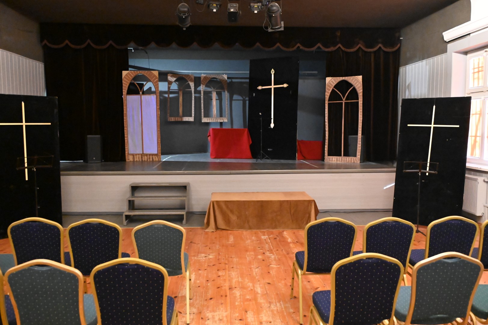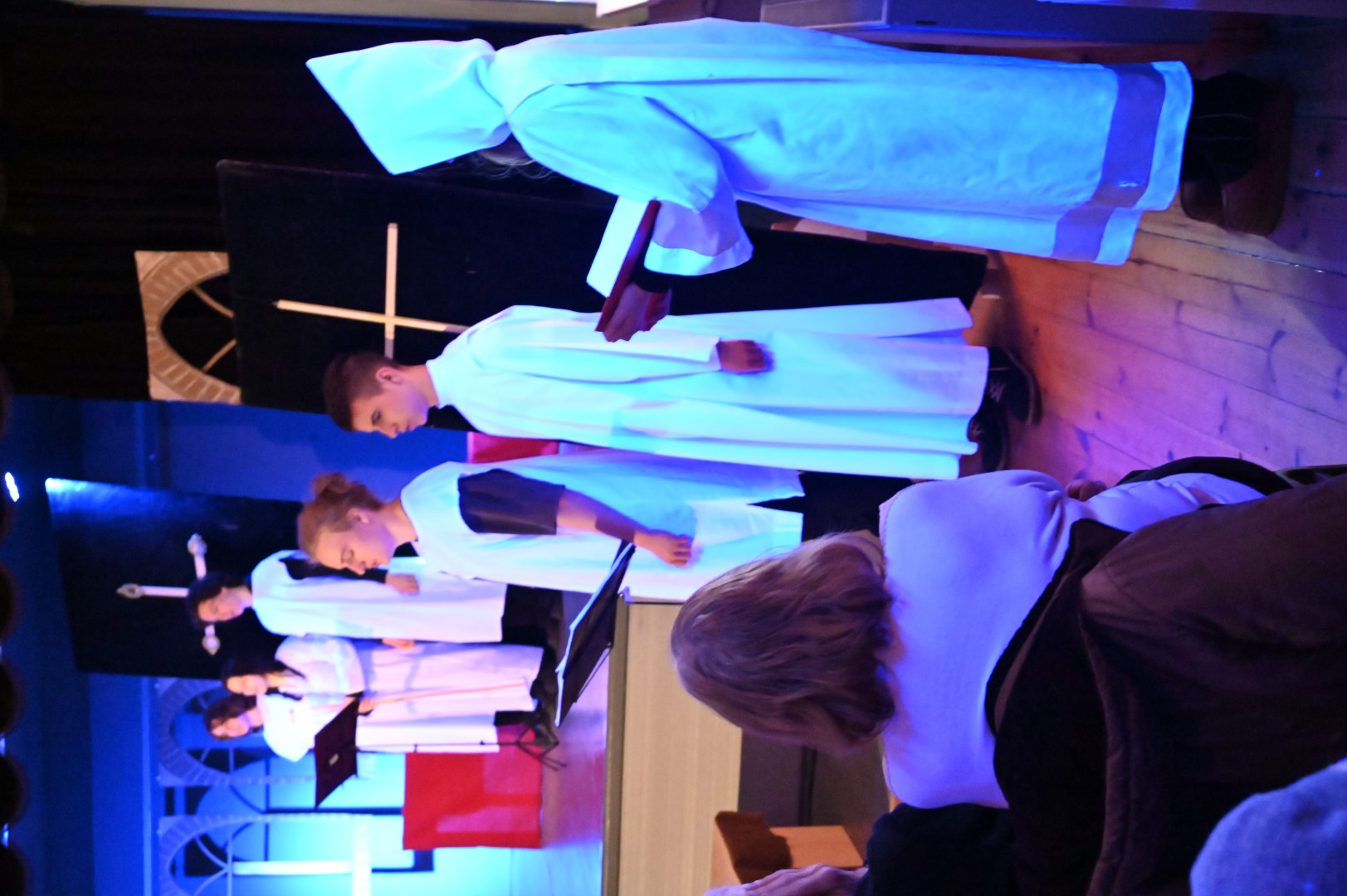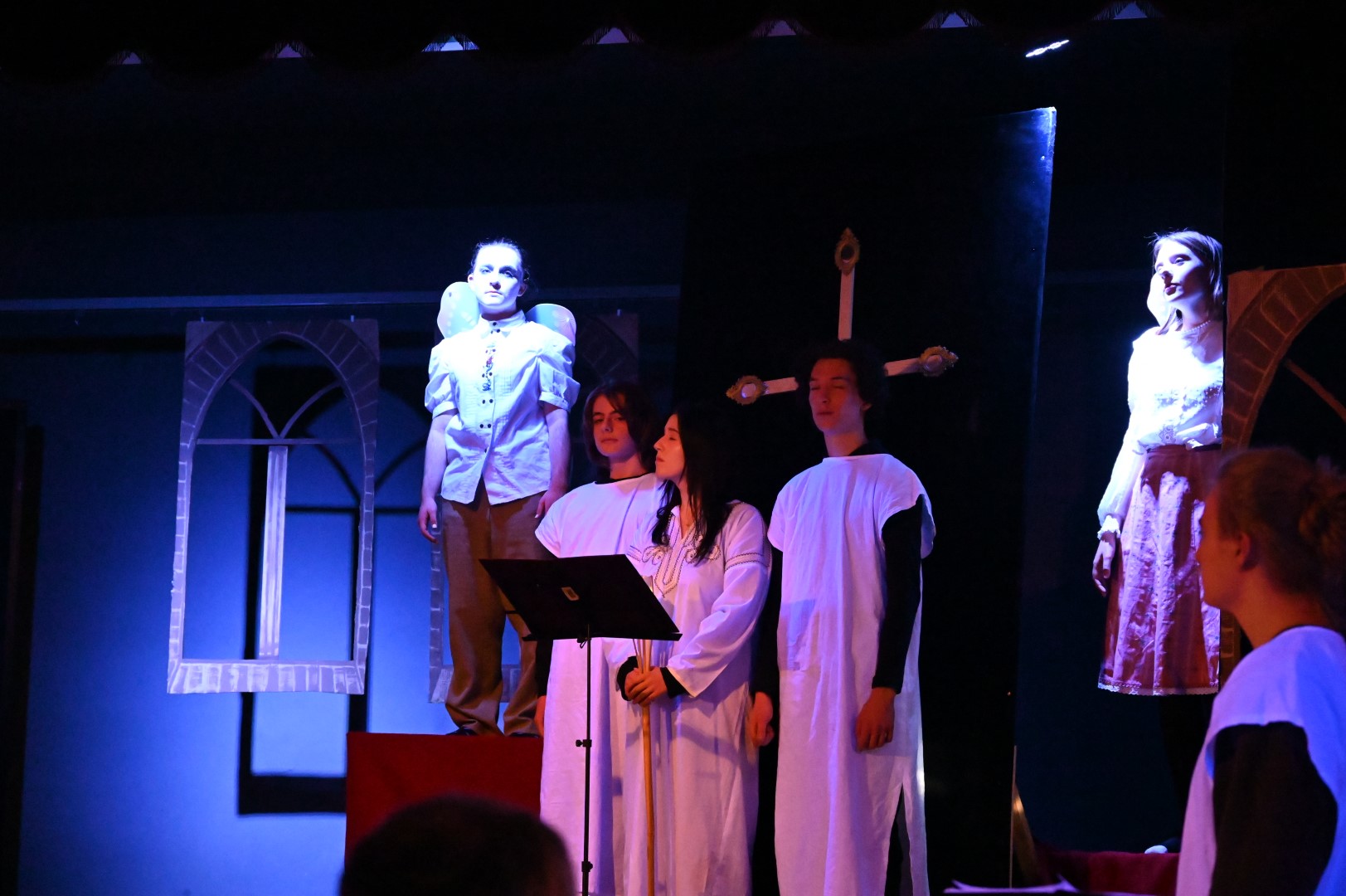 Wszystko zmieniło się po wejściu do środka, albowiem połączone jedną scenograficzną wizją widownia i scena, przywiodły na myśl wnętrze mrocznej i zatęchłej cmentarnej kaplicy. Cztery ostrołukowe okna, za którymi czaił się mrok, trzy czarne stojące katafalki zaakcentowane białymi krzyżami i zwieszające się nad nimi ciężkie draperie, wytworzyły nastrój jakże odmienny od wiosennej zewnętrznej aury. Przeszył nas dreszcz, zwłaszcza gdy najpierw zapadły ciemności, potem rozświetlone błękitnym, zimnym światłem scenicznym, a zewsząd popłynęła rapsodyczna muzyka. I zza naszych pleców wyłonił się korowód białych postaci sunących z powagą i w milczeniu na scenę i proscenium. Rozpoczął się tajemniczy, odwołujący się do magicznych rytuałów ludowy obrzęd przywoływania duchów, opisany sugestywnie przez Adama Mickiewicza w II części „Dziadów”.