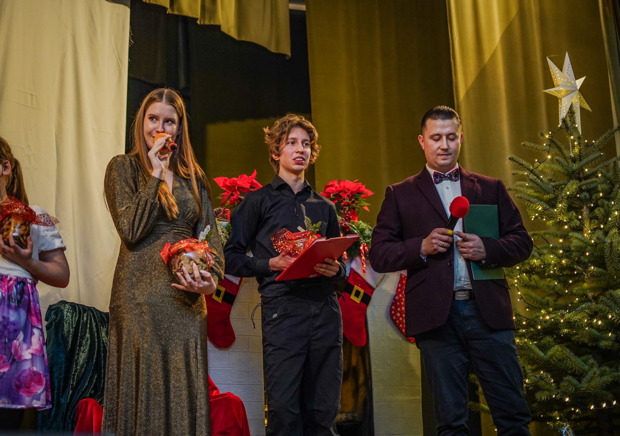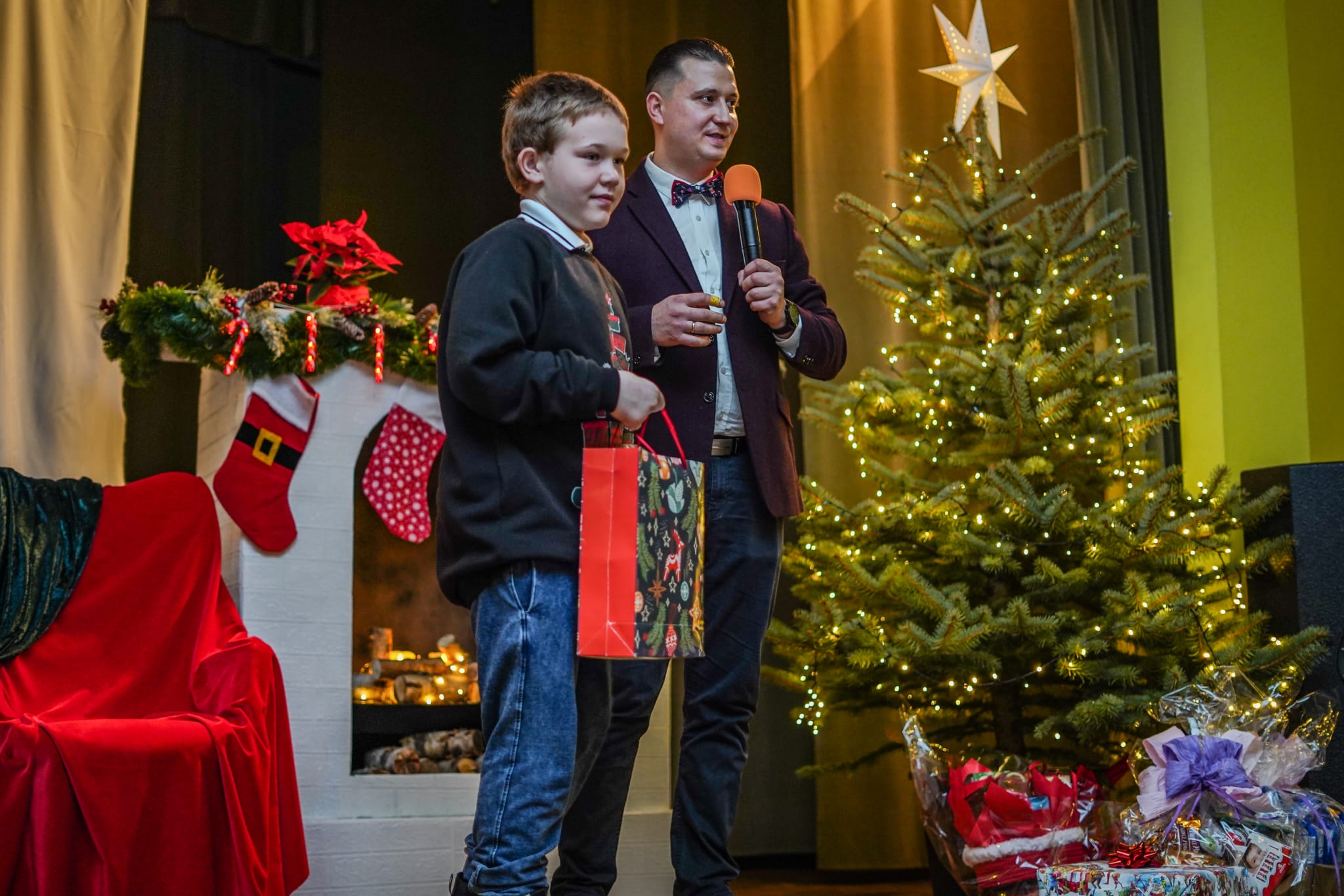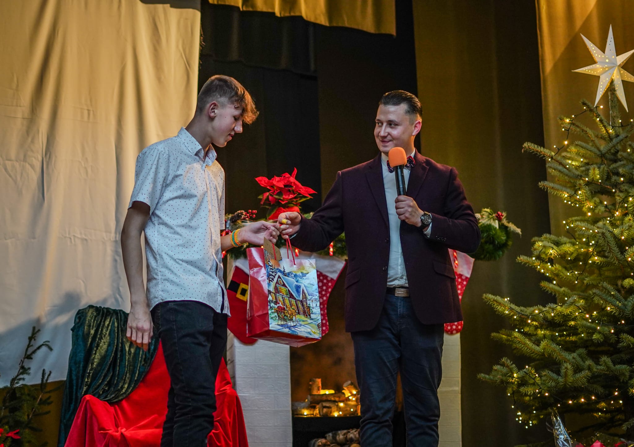 Po części powitalnej, w części artystycznej słyszeliśmy przepiękny koncert kolęd w wykonaniu wolontariuszy i absolwentów Zespołu Szkół w Pasłęku, grupy wokalnej z Domu Kultury z Godkowa, jak i również Jacka Wojnicza kolędującego w czasie posiłku. Niezapomnianym akcentem były osobiste życzenia przesłane przez Św. Mikołaja i prezenty dostarczone „na czas” do placówek. W jego imieniu Dyrektor wręczył po dwa (a może po trzy) prezenty dla każdego dziecka. Na te dzieci, które nie mogły uczestniczyć w wydarzeniu, prezenty będą czekały w placówkach.