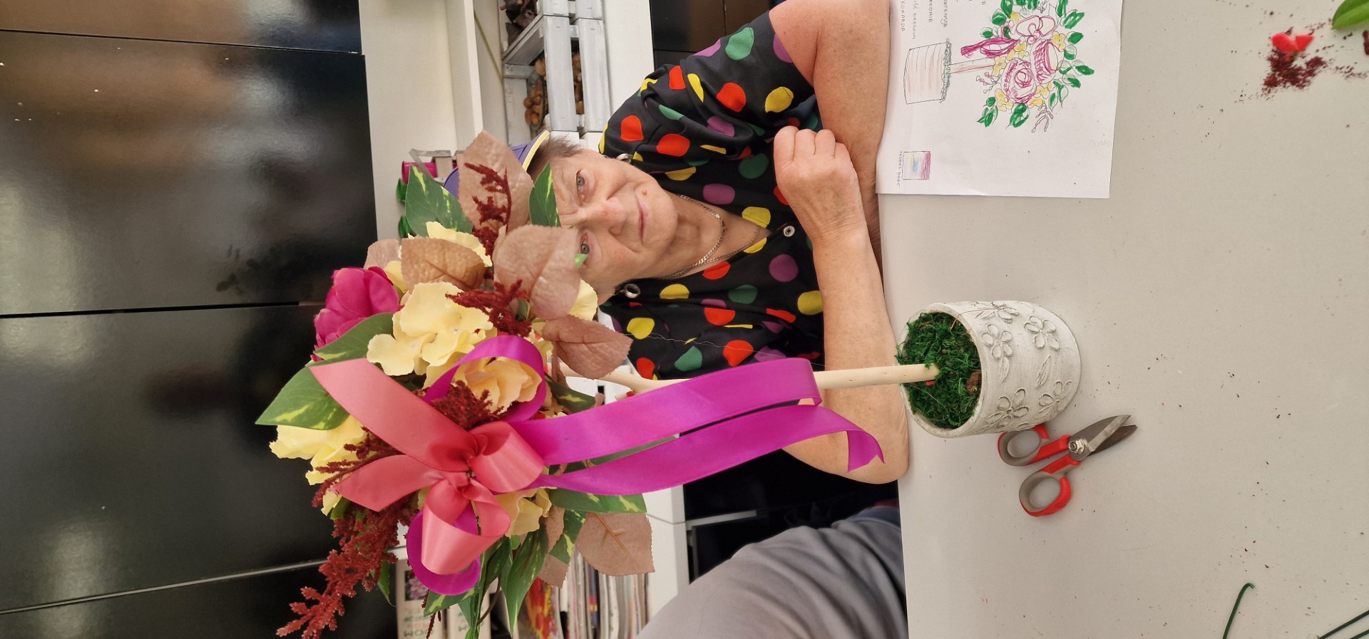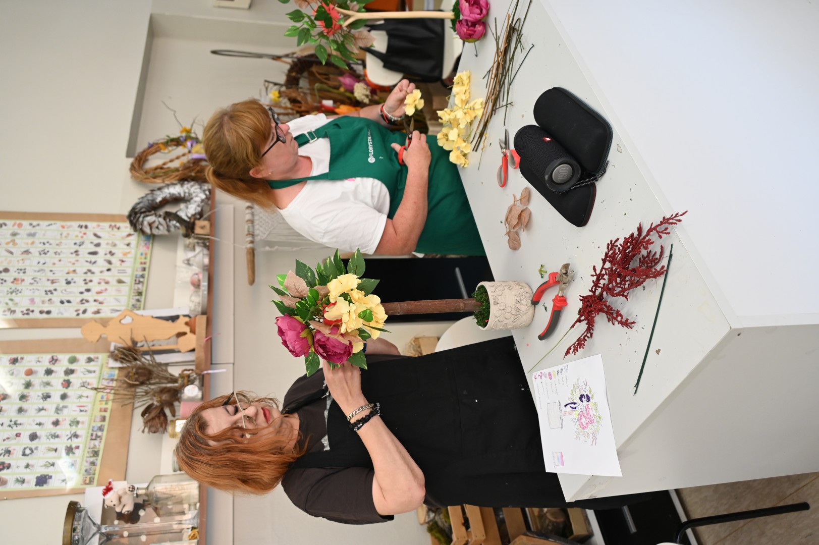 Po tym już zaczęły się na wpół profesjonalne zajęcia dziedzinowe. Jak nam wyjaśniła nauczycielka, zawodowy florysta rozpoczyna pracę od wykonania projektu kompozycji, którą zamierza wydobyć z niebytu ku uciesze oczu postronnych. Projekt zakłada ukazanie kompozycji w dwóch ujęciach – z boku i z góry, dokładne, przedstawione w skali odwzorowane w całej palecie barw. Z zapałem przystąpiliśmy zatem do angażującej inwencję i wyobraźnię sztuki projektowania; trzeba dodać, iż zadanie mieliśmy nieco ułatwione, gdyż Pani Anna schemat realizacji wcześniej nam przygotowała. Nasze zadanie polegać miało na wykonaniu florystycznej (nie ogrodowej) topiary czyli ozdobnego drzewka do dekoracji wnętrz, stanowiącego odmianę japońskiego bonsai. Naszą kompozycję tworzyła: wyściełana mchem doniczka, smukły pień oraz oplatający go układ złożony z peoni, hortensji, mahonii, liści, gałązek i zwieńczony kokardą. Nam przypadła rola indywidualnego doboru kolorów i harmonijnego zgrania całej tej misternej struktury.