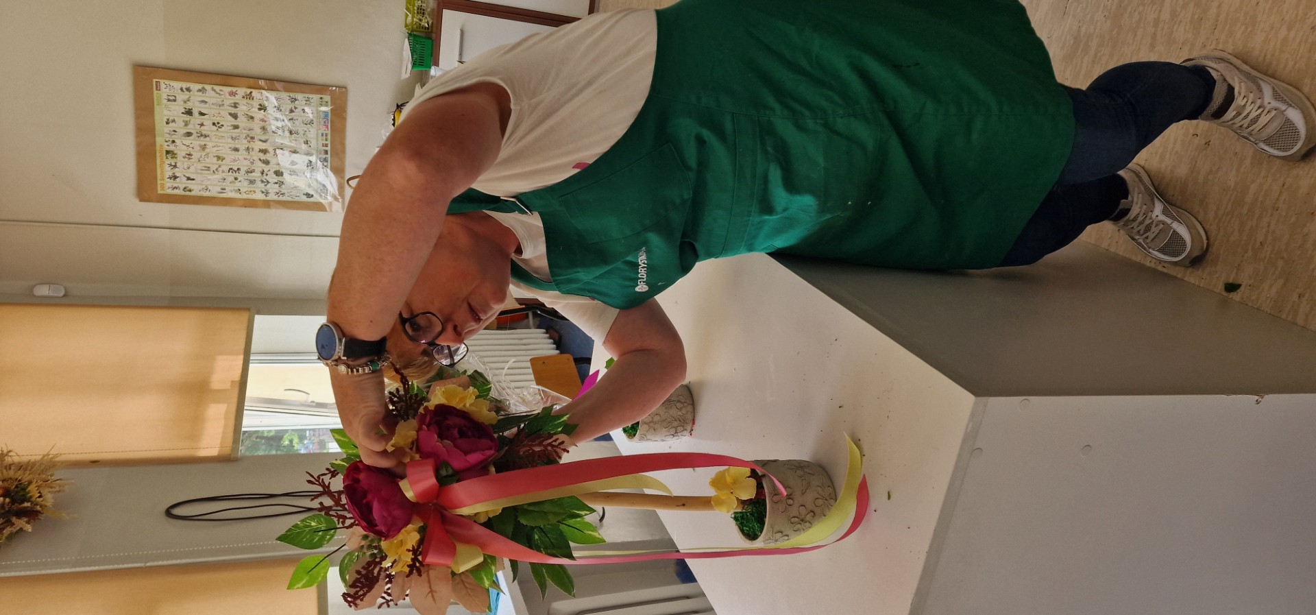 Zaopatrzeni w projekty zasiedliśmy dumnie na stanowiskach przygotowanych w pracowni florystycznej. Pod kierunkiem Pani Anny ręce nasze stały się zręczne, oczy bystro lustrowały każdy wykonany ruch, umysły zaś pracowały na pełnych obrotach osiągając kolejne stopnie prowadzące nas ku prawdziwej umiejętności. Tak tworząc pochłanialiśmy i przyswajaliśmy sobie kolejne tajniki sztuki florystycznej, odnotowując m.in. że: florystyka, pomimo związku z kwiatami i ich układaniem, to jednak inna rzecz niż ogrodnictwo; we florystyce najważniejsze są druty i druciki (to za ich pomocą spajamy przecież całą kompozycję, nie mogą jednak rzucać się w oczy); czerwona gąbka ozdobna – w przeciwieństwie do zielonej – nie musi być całkowicie zakrywana, a stanowi ona prawdziwe clue całego przedsięwzięcia, bo wszak w niej osadzamy elementy naszej kompozycji.