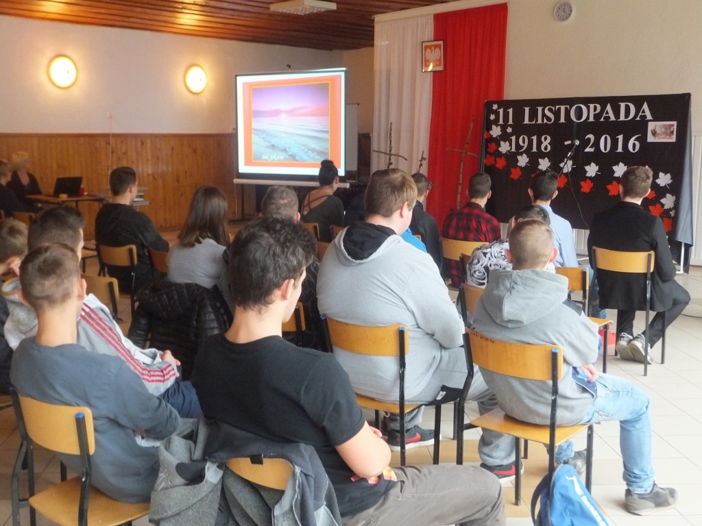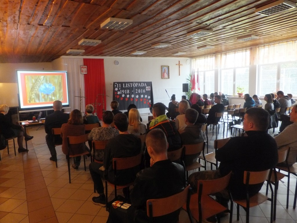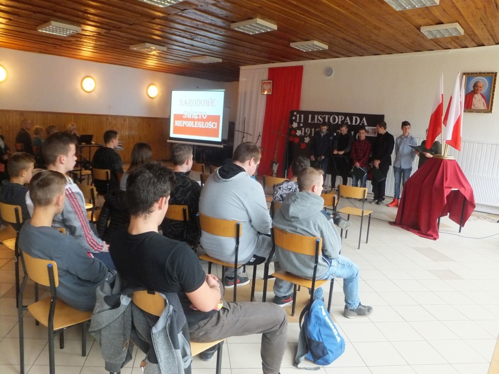 17 listopada w naszej szkole słuchacze w poczuciu radości i dumy z odzyskanej niepodległości świętowali jeden z najważniejszych dni w kalendarzu każdego Polaka. Podczas uroczystości przypomniane zostały lata niewoli ojczyzny, dzieje narodu polskiego w okresie zaborów, krwawo tłumione zrywy narodowowyzwoleńcze oraz wszystkie działania aż do dnia, w którym wzeszła jutrzenka wolności. Przekazywane treści były przeplatane patriotycznymi pieśniami oraz recytacjami wierszy. Słuchacze wielokrotnie akcentowali fakt, że 11 listopada został uświęcony krwią, męczeństwem i ofiarnością Polaków, którzy dziś są symbolem jedności narodowej i patriotyzmu. Apelowali do swoich kolegów, aby pamiętali, iż wolność raz zdobyta i niepodległość raz osiągnięta nie jest czymś trwałym, tylko czymś danym, co trzeba pielęgnować.