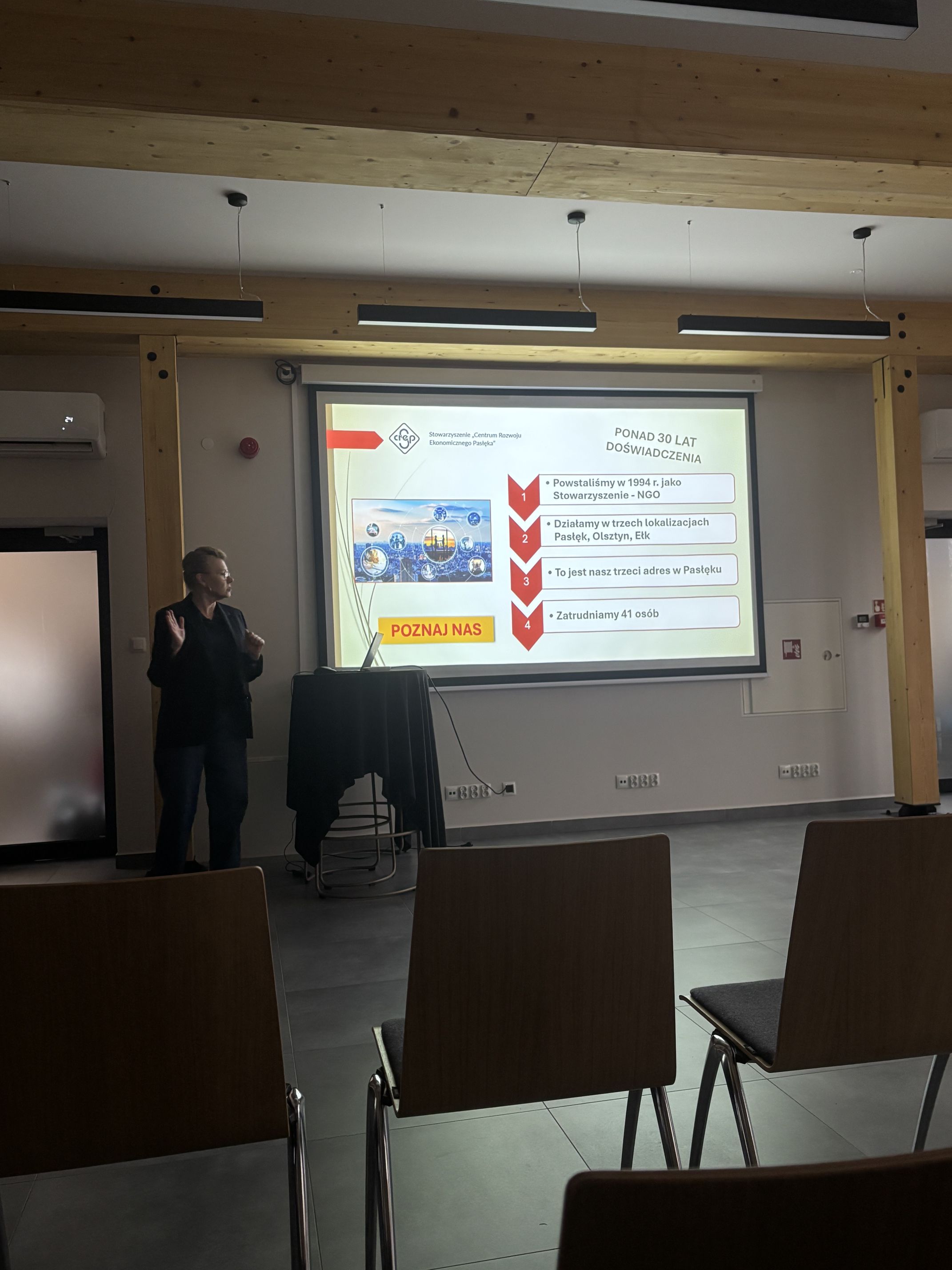 Prezes Bąkowska omówiła również dostępne formy dofinansowania do szkoleń dla przedsiębiorców, ich pracowników oraz osób fizycznych. Stowarzyszenie realizuje szereg programów finansowanych ze środków Unii Europejskiej na terenie województwa warmińsko‑mazurskiego oraz województw ościennych.