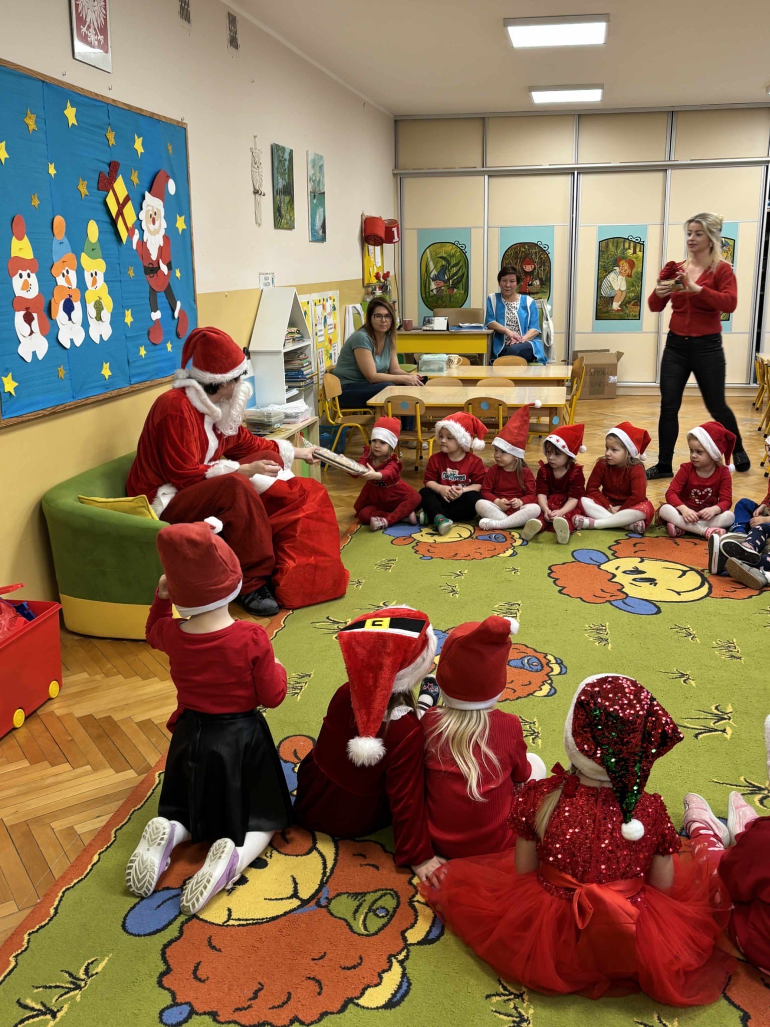 Przedszkolaki z dużym entuzjazmem uczestniczyły w zabawach i konkurencjach. Jednym z najbardziej wyczekiwanych momentów było wspólne czytanie opowieści o Świętym Mikołaju, które spotkało się z ogromnym zainteresowaniem maluchów.