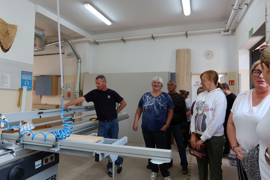 Następnie grupa odwiedziła stolarnię, gdzie zaprezentowano narzędzia i maszyny stolarskie oraz omówiono kolejne etapy powstawania wyrobów.