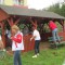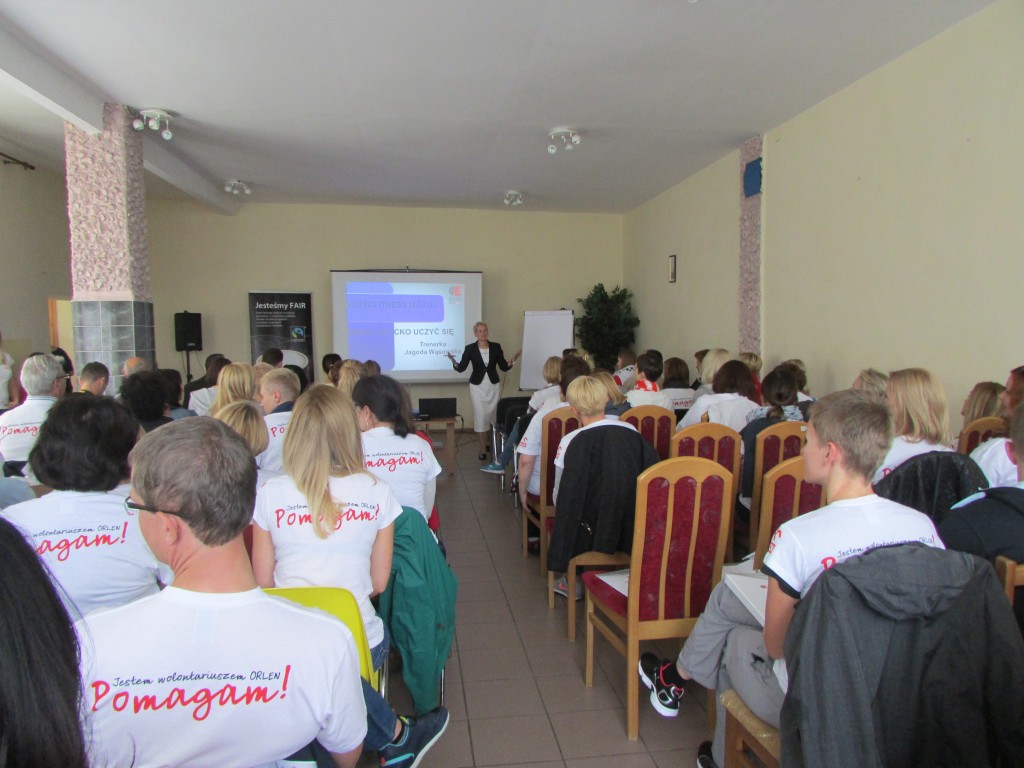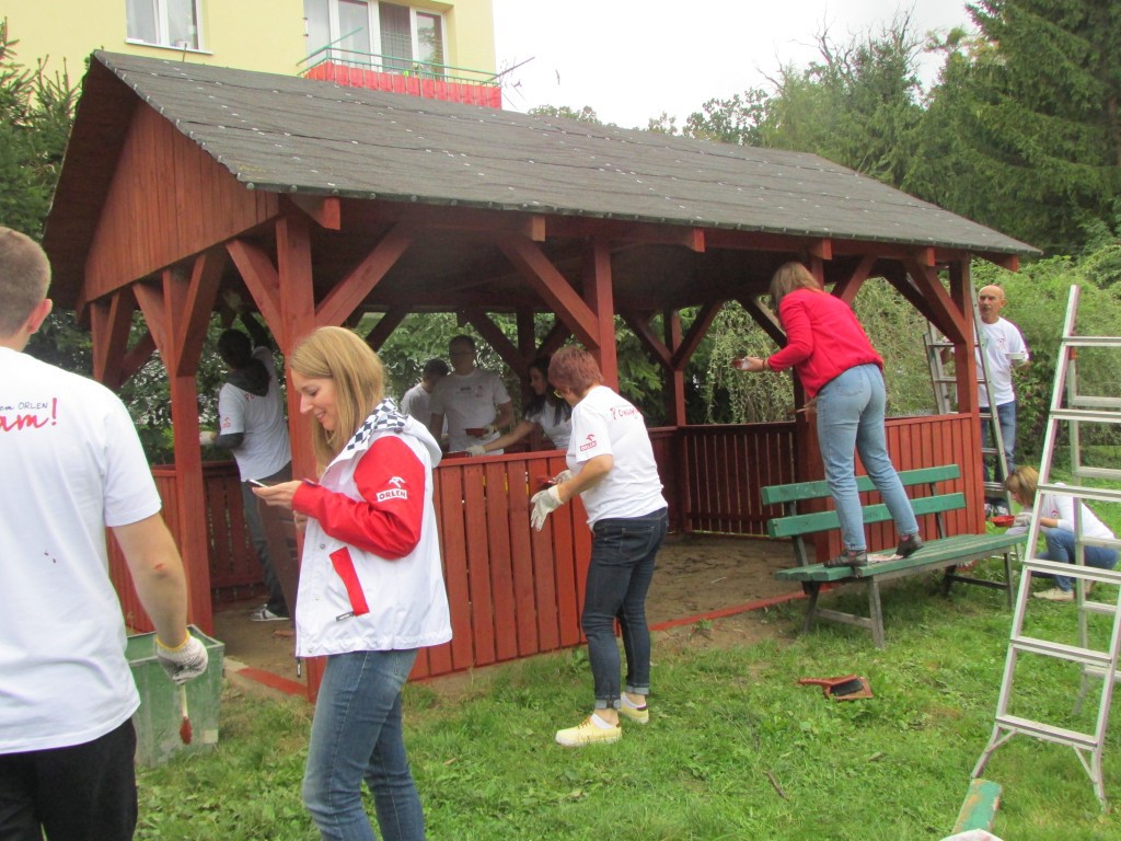 PKN Orlen nie zapomniał również o dorosłych, którzy na co dzień pracują z dziećmi. Jagoda Wąsowska poprowadziła wykład i warsztaty z tajemniczo brzmiącej dziedziny wiedzy- neurofitnessu- czyli jak nauczyć dziecko uczyć się. Przy tej okazji kadra mogła poznać nie tylko budowę i funkcję mózgu ale również techniki gimnastyki mózgu. Niewiarygodnie, że o dendrytach, aksonie, osłonce mielinowej można tak ciekawie mówić. Jedni rozwijali się intelektualnie inni dziarsko pracowali: wolontariusze postawili budę dla placówkowego psa – Dory, zakonserwowali i pomalowali wiatę przy stawku, kupili i zamontowali pralkę dla dzieci z grupy I wychowawczej. W między czasie dla ciała też coś było: hot-dogi i zapiekanki dla smakoszy fast - foodów od Orlenu- pod dostatkiem. Ale placówka nie była dłużna i przygotowała w kuchni polowej przepyszną grochówkę to już tradycja naszego domu).