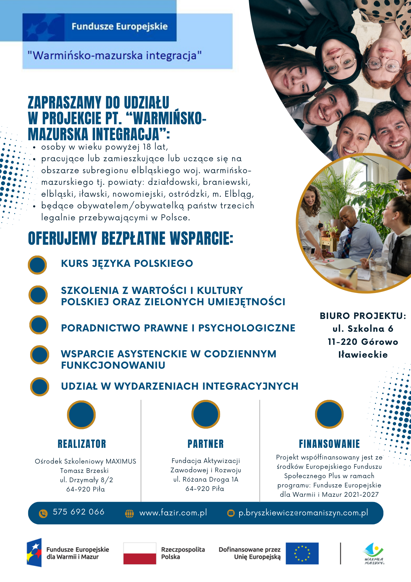 Ośrodek Szkoleniowy MAXIMUS Tomasz Brzeski w partnerstwie z Fundacją Aktywizacji Zawodowej i Rozwoju zapraszają do udziału w projekcie pn. „Warmińsko-mazurska integracja”, nr FEWM.09.03-IZ.00-0067/23 realizowanym na obszarze subregionu elbląskiego, woj. warmińsko-mazurskie (powiaty: braniewski, elbl…
