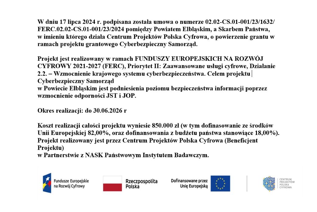 W dniu 17 lipca 2024 r. podpisana została umowa o numerze 02.02-CS.01-001/23/1632/ FERC.02.02-CS.01-001/23/2024 pomiędzy Powiatem Elbląskim, a Skarbem Państwa, w imieniu którego działa Centrum Projektów Polska Cyfrowa, o powierzenie grantu w ramach projektu grantowego Cyberbezpieczny Samorząd.