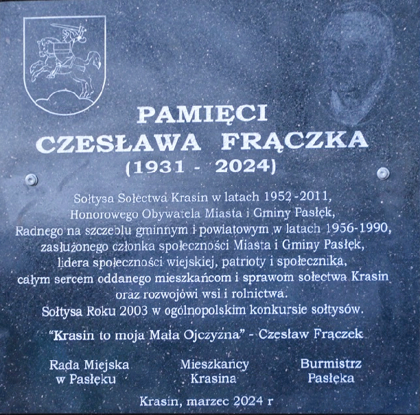 W dniu 25 marca br. w Krasinie odbyło się uroczyste odsłonięcie pamiątkowej tablicy poświęconej śp. Czesława Frączka, którą umieszczono na budynku świetlicy wiejskiej. Obecna była rodzina, mieszkańcy wsi Krasin a także Maciej Romanowski Starosta Elbląski, Marian Matuszczak Przewodniczący Rady Miejsk…