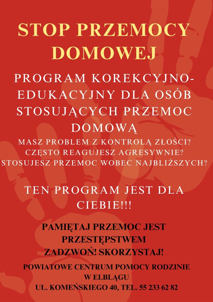 Powiatowe Centrum Pomocy Rodzinie w Elblągu rozpoczęło rekrutację uczestników do Programu korekcyjno – edukacyjnego dla osób stosujących przemoc domową zamieszkałych na terenie Powiatu Elbląskiego.