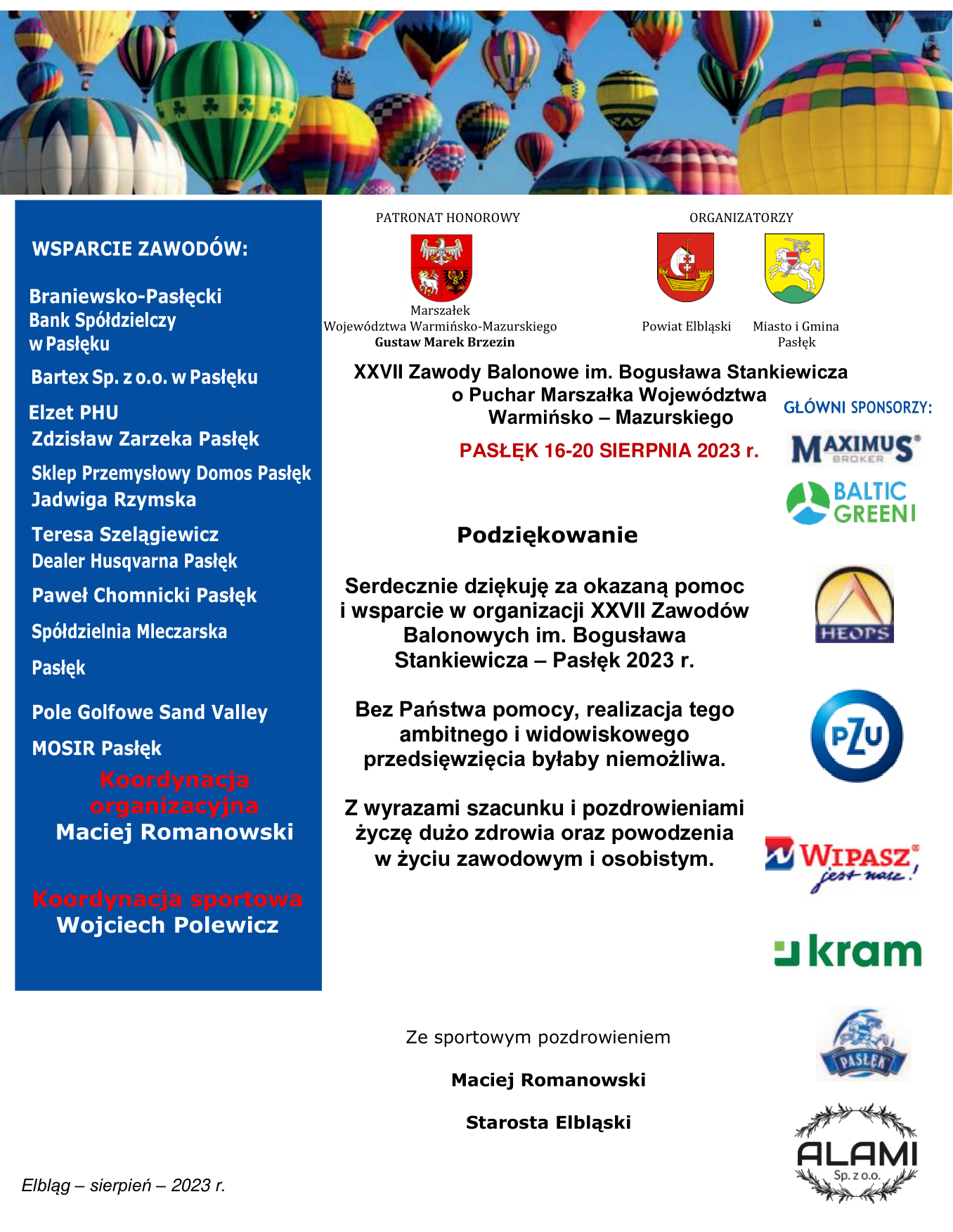 W sobotni wieczór (19 sierpnia) w Zespole Szkół Ekonomicznych i Technicznych w Pasłęku uroczyście zakończono XXVII Zawody Balonowe poświęcone pamięci Bogusława Stankiewicza. Zawody wygrał Robert Helak, drugie miejsce zajął Marek Banasiuk a trzecie Waldemar Lekan. Nagrody dla najlepszych pilotów…