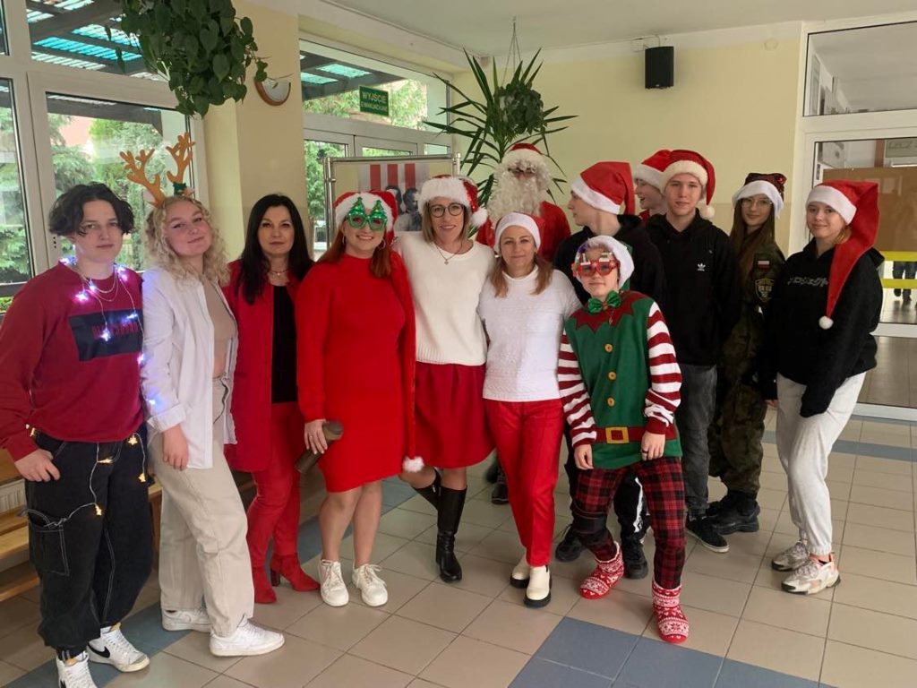 Przez cały dzień panował świąteczny nastrój Do szkoły zawitał Mikołaj wraz ze swoimi Mikołajkami i pomocnikami. Na korytarzach dominował czerwony kolor, rozbrzmiewał dźwięk dzwonka św. Mikoła…