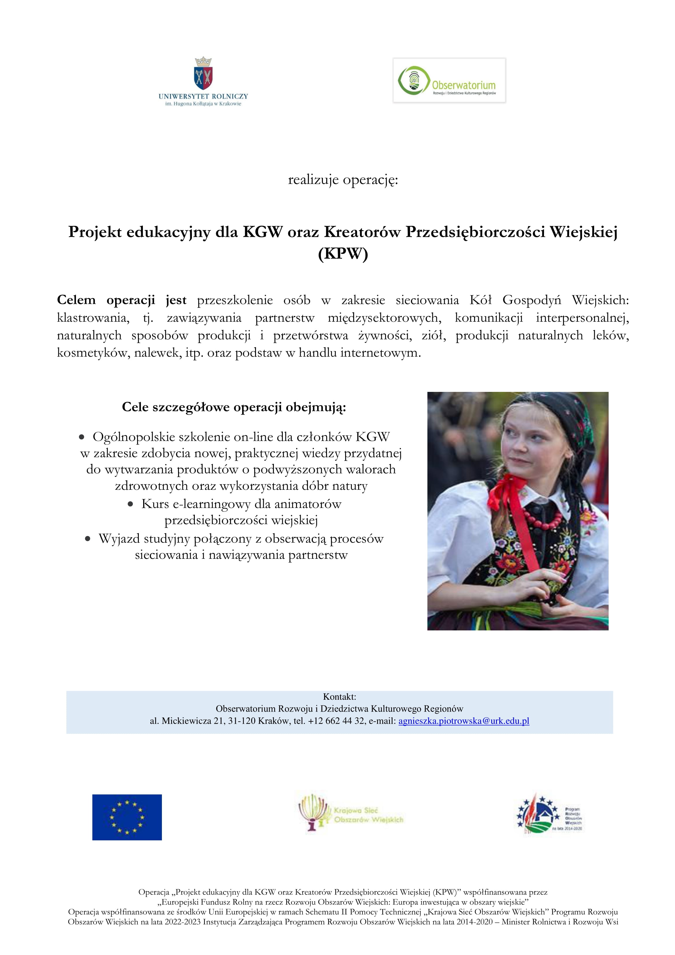 Operacja „Projekt edukacyjny dla KGW oraz Kreatorów Przedsiębiorczości Wiejskiej (KPW) współfinansowana przez„Europejski Fundusz Rolny na rzecz Rozwoju Obszarów Wiejskich: Europa inwestująca w obszary wiejskie”. Operacja współfi…