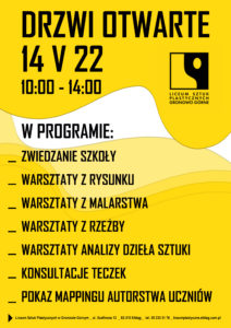 Liceum Sztuk Plastycznych w Gronowie Górnym serdecznie zaprasza uczniów i rodziców do wzięcia udziału w drzwiach otwartych szkoły, które odbędą się w już w tę sobotę 14 maja w godz. od 10.00 do 14.00.