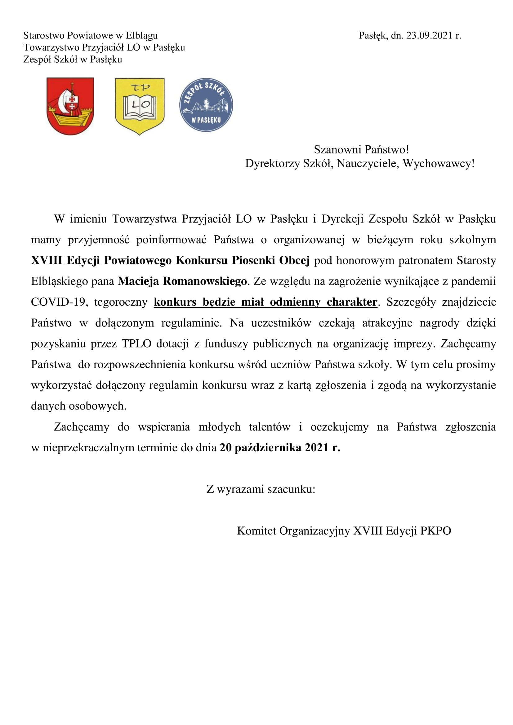 W środę 29 września 2021 r. w Zespole Szkół w Pasłęku odbyło się ślubowanie. Zebranych powitała pani dyrektor, Elżbieta Wasiuk, kierując do uczniów klas pierwszych szczególnie ciepłe słowa i gratulując im wyboru szkoły. Pierwszoklasiści złożyli uroczyste ślubowanie na sztandar szkoły, przy…