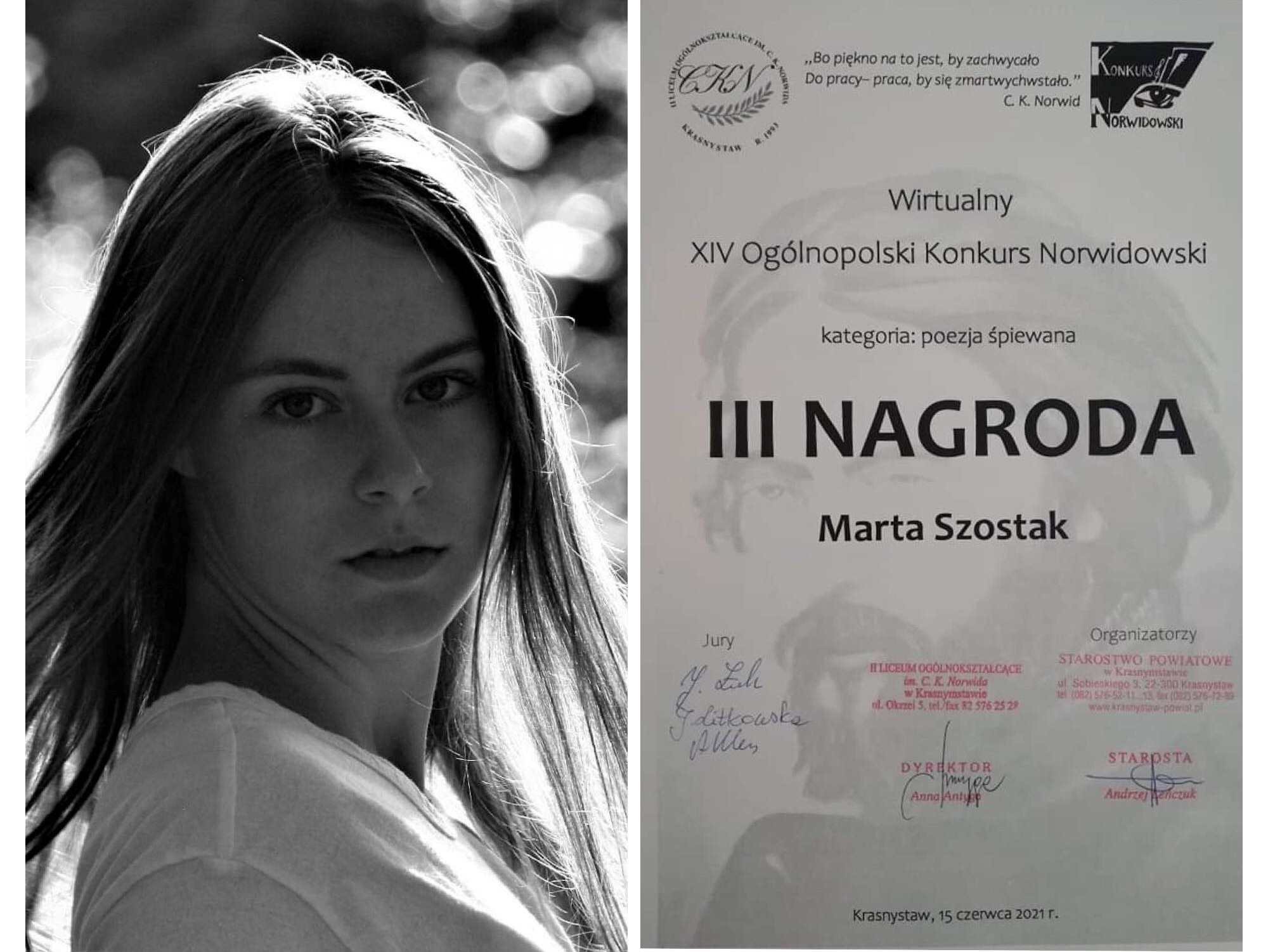 Miło nam poinformować, że Marta Szostak, uczennica klasy I Liceum Sztuk Plastycznych w Gronowie Górnym, zdobyła III NAGRODĘ w Wirtualnym XIV Ogólnopolskim Konkursie Norwidowskim organizowanym przez Liceum Ogólnokształcące im. C. K. Norwida w Krasnymstawie oraz Starostwo Powiatowe w Krasnymstawie.