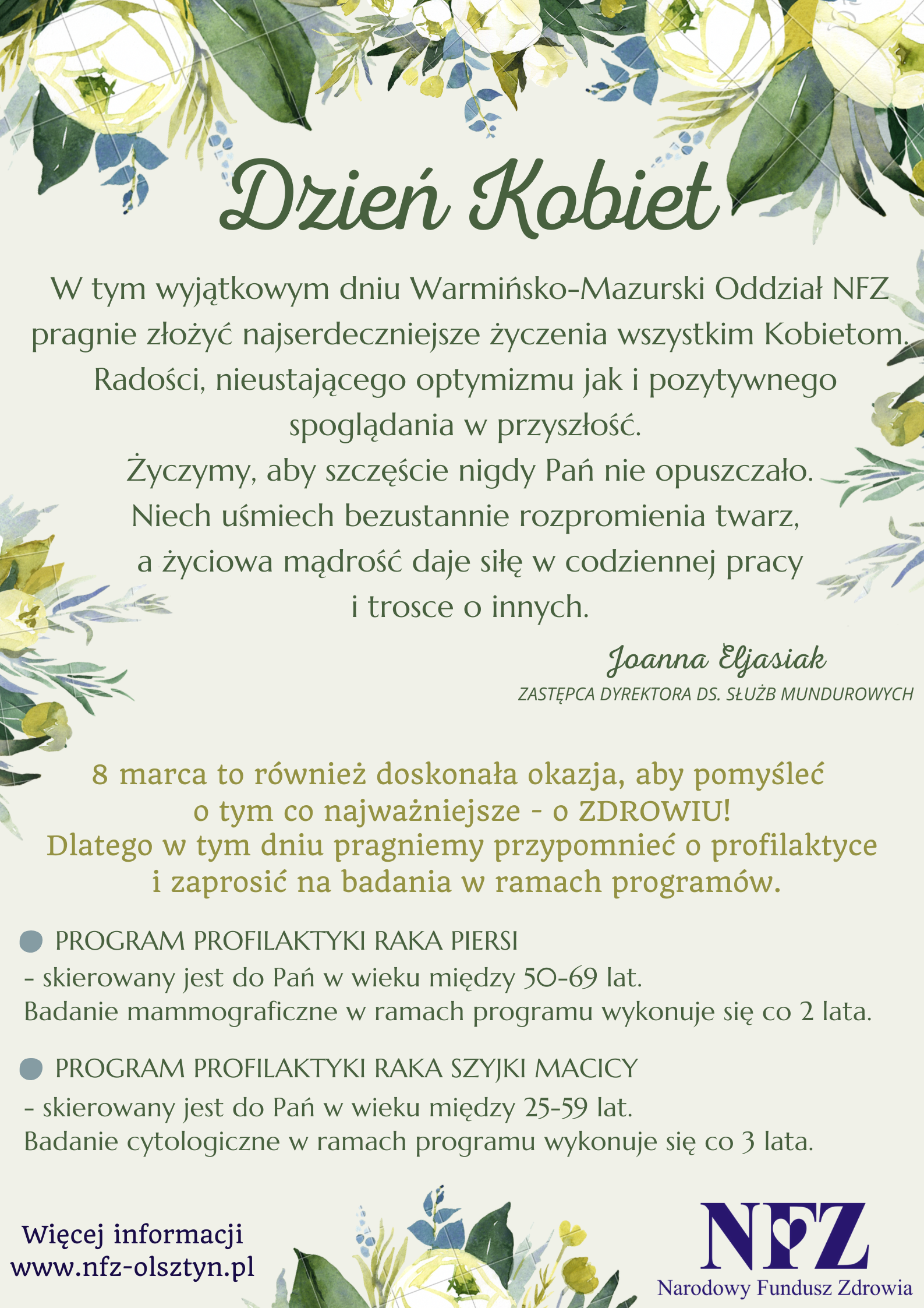 Czytaj więcej: Życzenia Warmińsko-Mazurskiego Oddziału Wojewódzkiego NFZ z okazji Dnia Kobiet