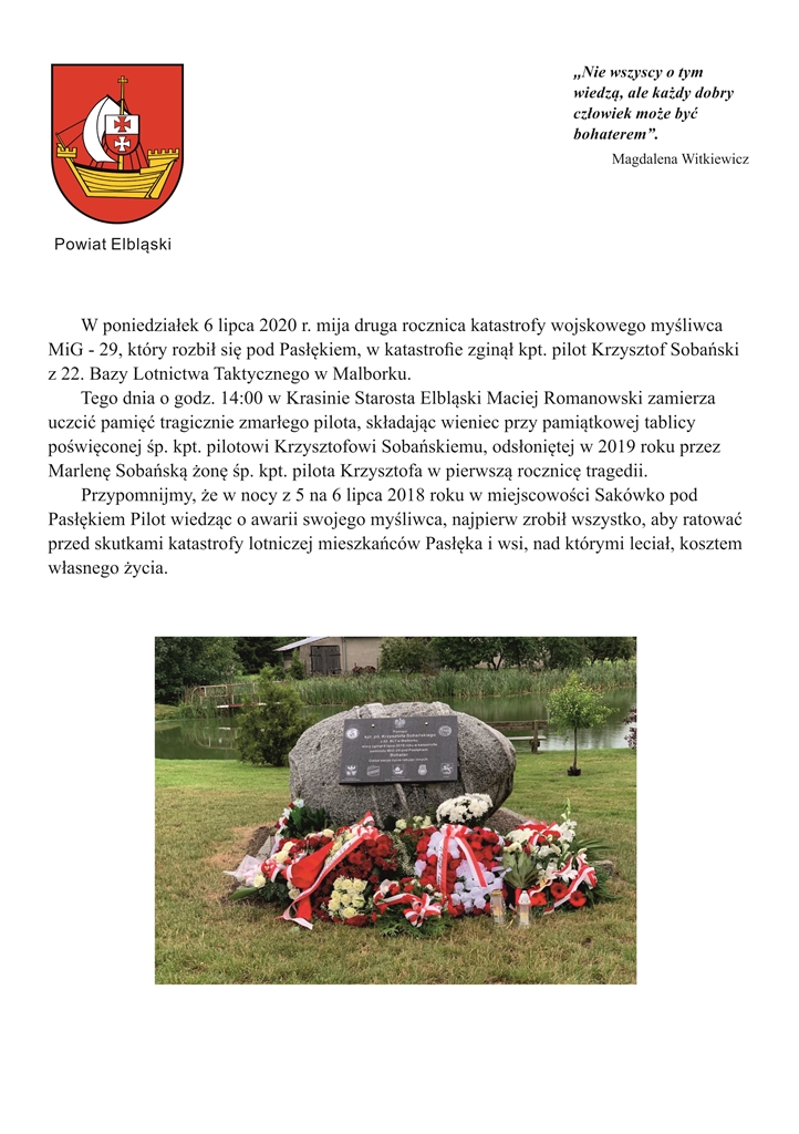 Czytaj więcej: Starosta Elbląski uczci pamięć tragicznie zmarłego pilota
