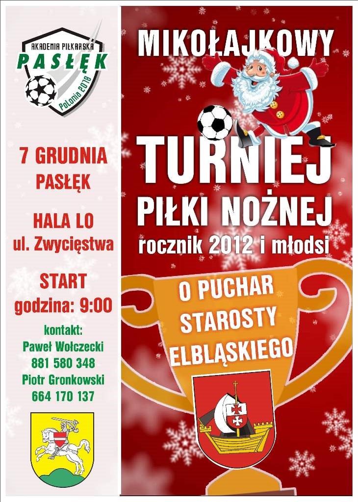 W dniu 7 grudnia 2019 r. na Sali sportowej w Zespole Szkół w Pasłęku zorganizowany został Mikołajkowy Turniej piłki Nożnej o Puchar Starosty Elbląskiego rocznika 2012 i młodsi.