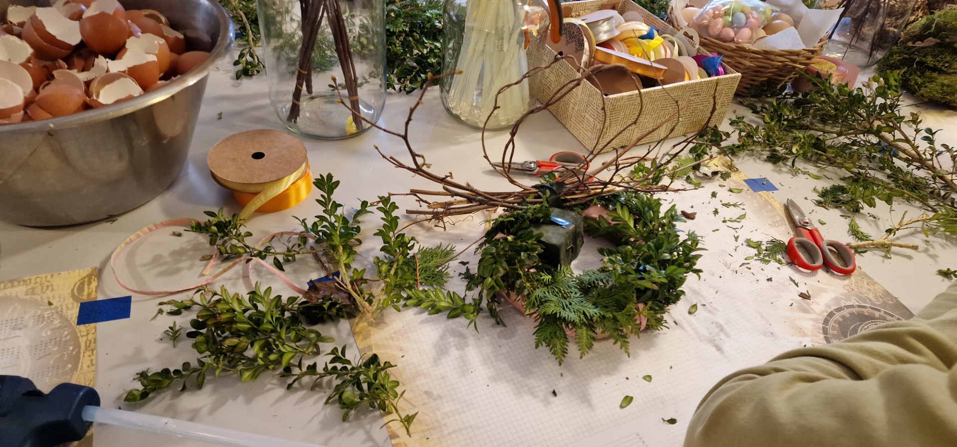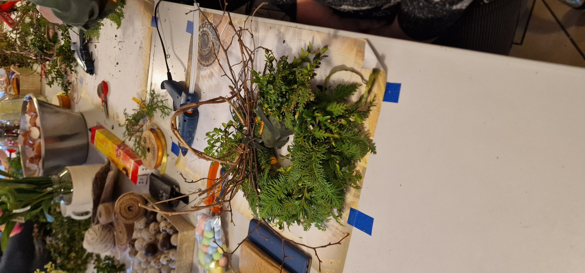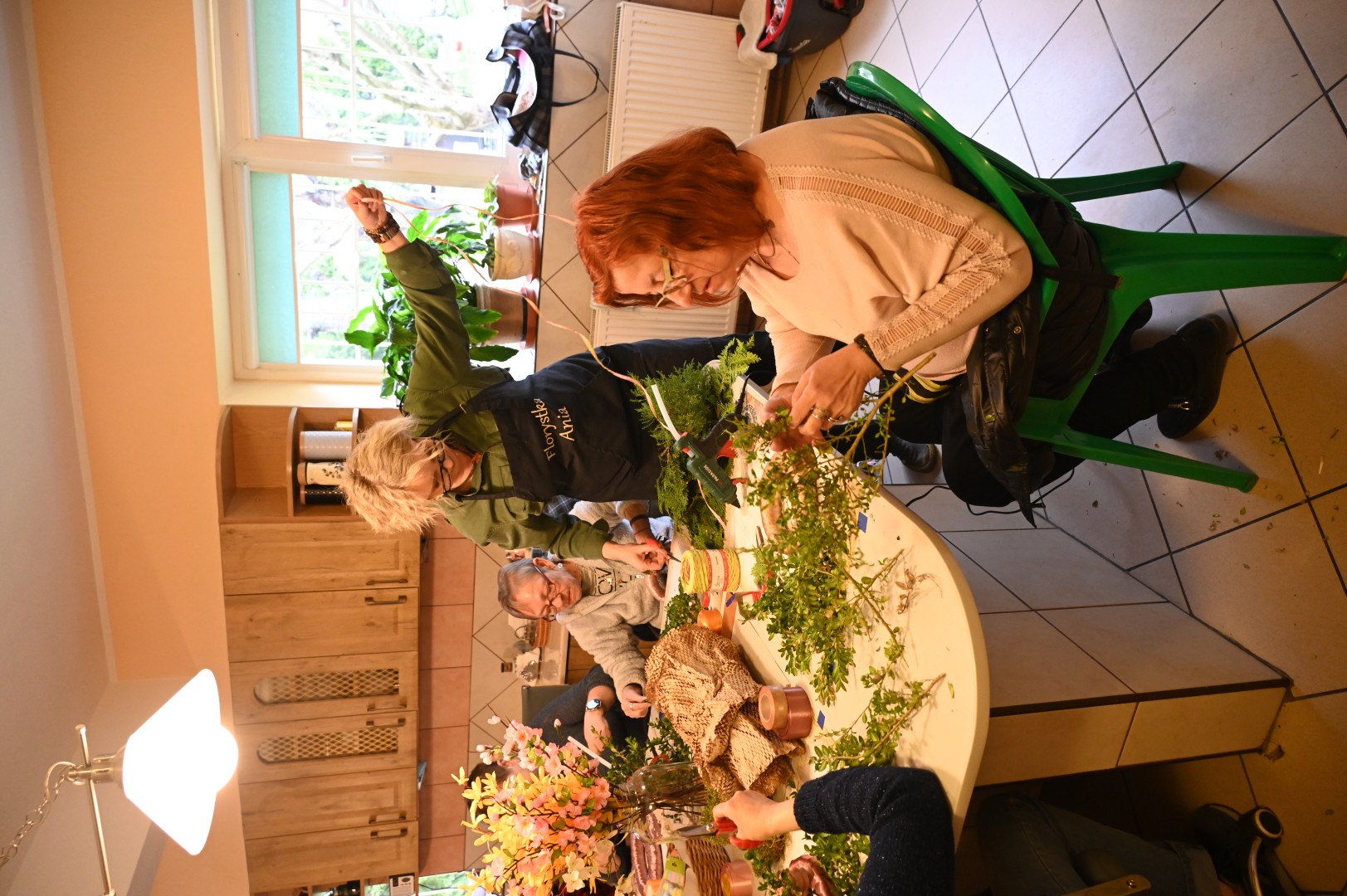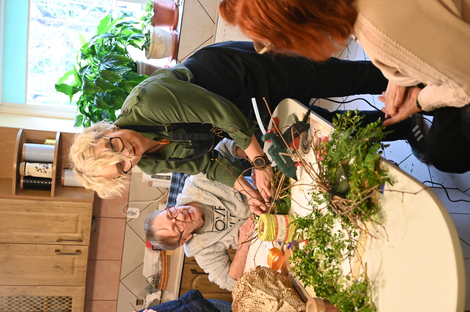 Poszukaliśmy i odnaleźliśmy najlepszą florystkę w Elblągu i zaprosiliśmy ją do nas. Pani Anna Stoltmann-Stefaniak, doradca zawodowy, florystka pracująca w Centrum Kształcenia Zawodowego i Ustawicznego w Elblągu, nasze zaproszenie przyjęła chętnie i przyjechała do Tolkmicka w dniu 24 marca 2025 roku. Przygotowywaliśmy się do tego spotkania, do prowadzonych wspaniale zajęć, przez długi czas albowiem florystyka wymaga pracy z surowcami naturalnymi, które najlepiej jest zdobyć i spreparować samemu, a nie po prostu kupić. Zbieraliśmy zatem mech, korę, skorupki jajek, bukszpan, gałązki tui, wierzby i wiśni, dodaliśmy do tego trochę materiałów ozdobnych typu wstążki i piórka, odrobinę sztucznych (jednak) kwiatków i wysypaliśmy całe to bogactwo na długi stół. I rozpoczęliśmy pracę pod kierunkiem Pani Anny. Nasze zadanie polegało na samodzielnym wykonaniu stroika świątecznego. Trzeba tu nadmienić, że florystyka dzieli się na kilka dziedzin, w tym na florystykę ślubną, żałobną, komunijną, okolicznościową i świąteczną, my zatem zaczęliśmy zgłębiać tajniki tej ostatniej.