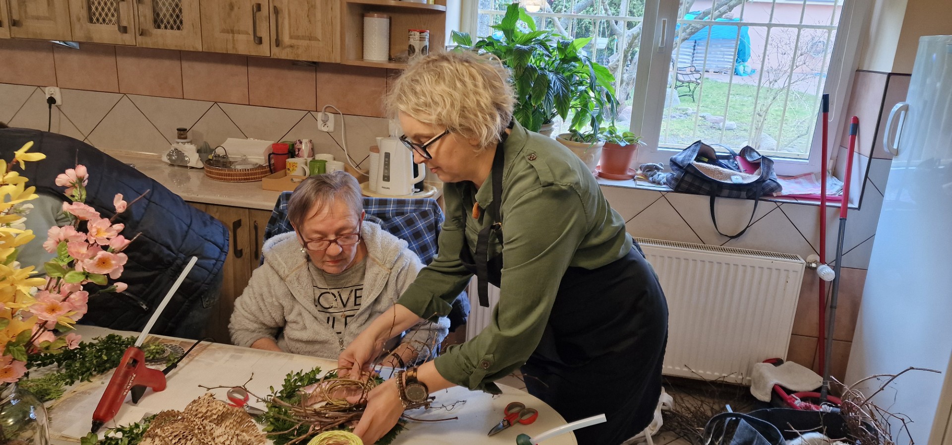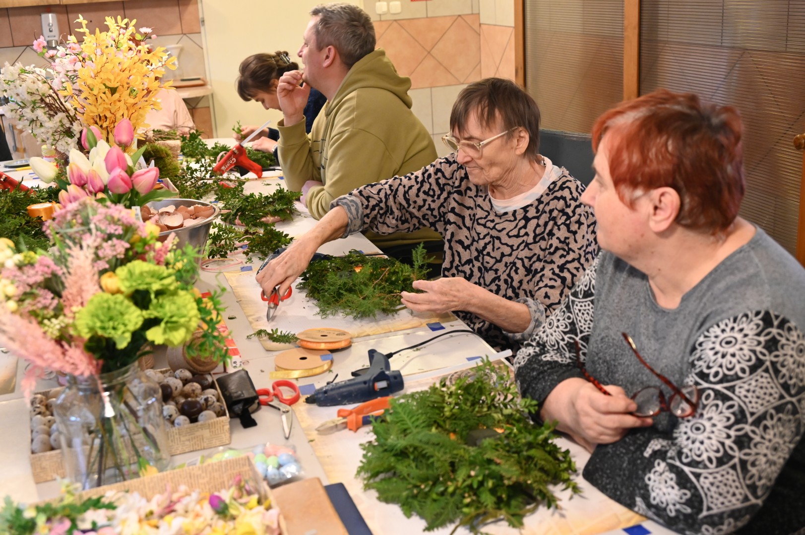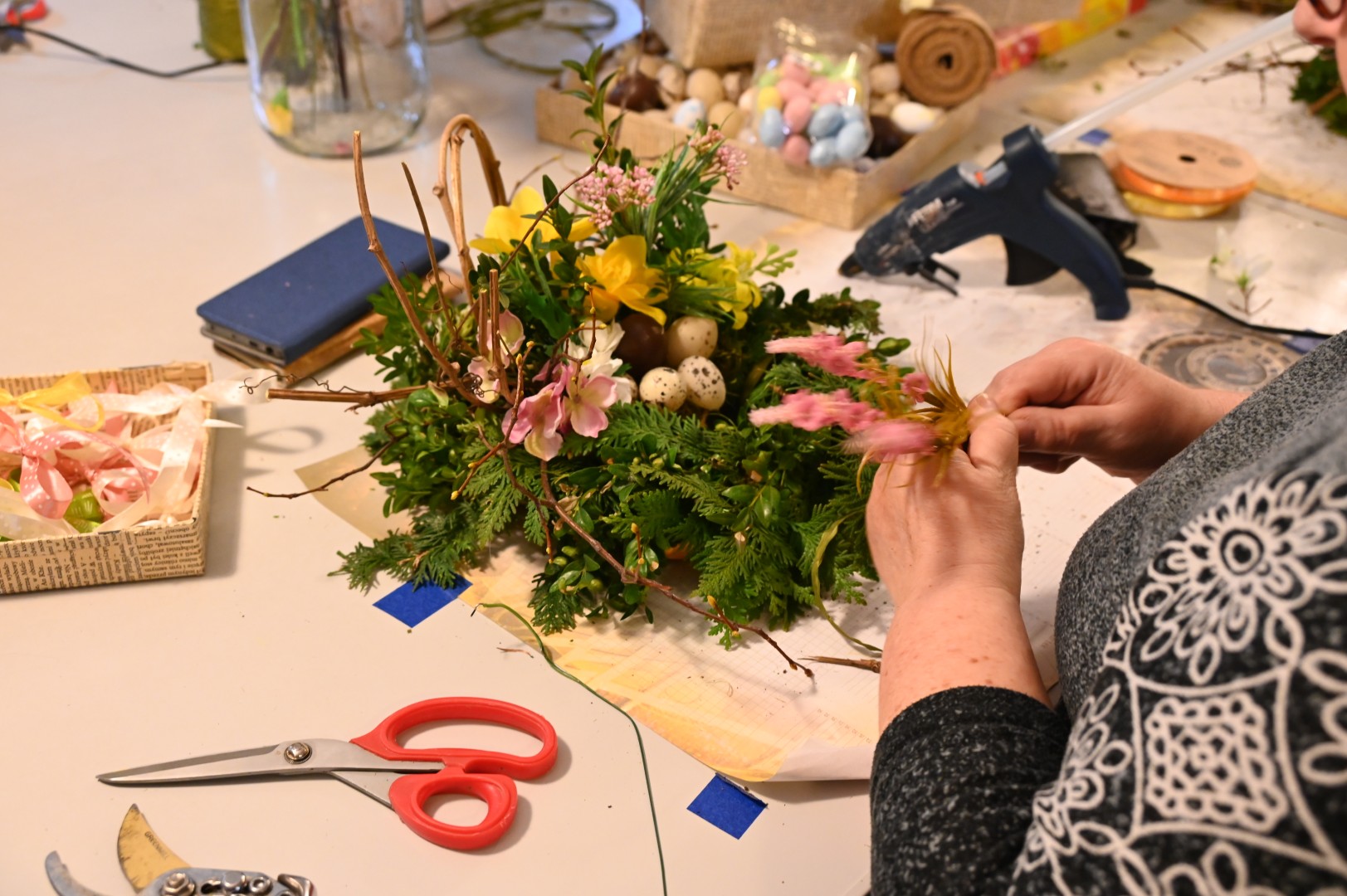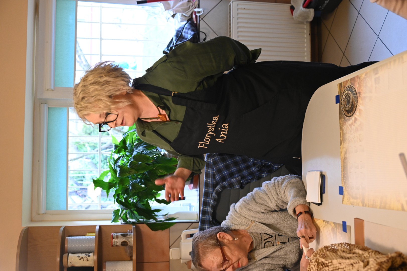 Poszukaliśmy i odnaleźliśmy najlepszą florystkę w Elblągu i zaprosiliśmy ją do nas. Pani Anna Stoltmann-Stefaniak, doradca zawodowy, florystka pracująca w Centrum Kształcenia Zawodowego i Ustawicznego w Elblągu, nasze zaproszenie przyjęła chętnie i przyjechała do Tolkmicka w dniu 24 marca 2025 roku. Przygotowywaliśmy się do tego spotkania, do prowadzonych wspaniale zajęć, przez długi czas albowiem florystyka wymaga pracy z surowcami naturalnymi, które najlepiej jest zdobyć i spreparować samemu, a nie po prostu kupić. Zbieraliśmy zatem mech, korę, skorupki jajek, bukszpan, gałązki tui, wierzby i wiśni, dodaliśmy do tego trochę materiałów ozdobnych typu wstążki i piórka, odrobinę sztucznych (jednak) kwiatków i wysypaliśmy całe to bogactwo na długi stół. I rozpoczęliśmy pracę pod kierunkiem Pani Anny. Nasze zadanie polegało na samodzielnym wykonaniu stroika świątecznego. Trzeba tu nadmienić, że florystyka dzieli się na kilka dziedzin, w tym na florystykę ślubną, żałobną, komunijną, okolicznościową i świąteczną, my zatem zaczęliśmy zgłębiać tajniki tej ostatniej.