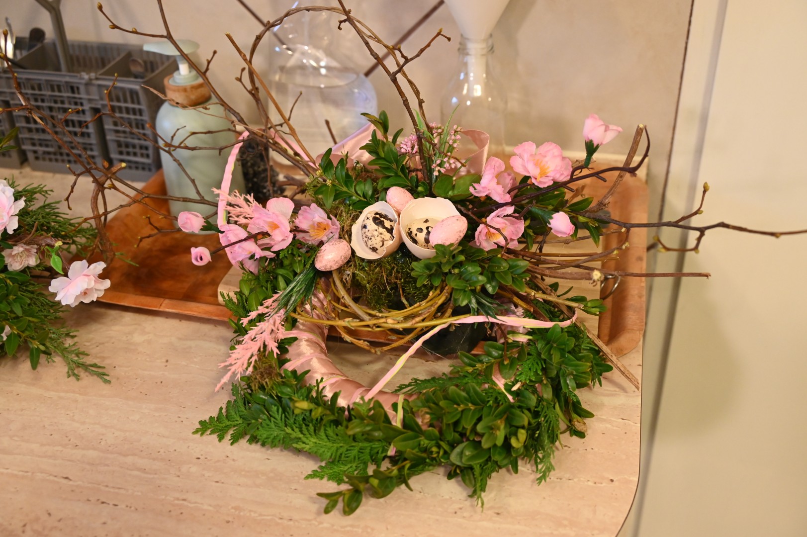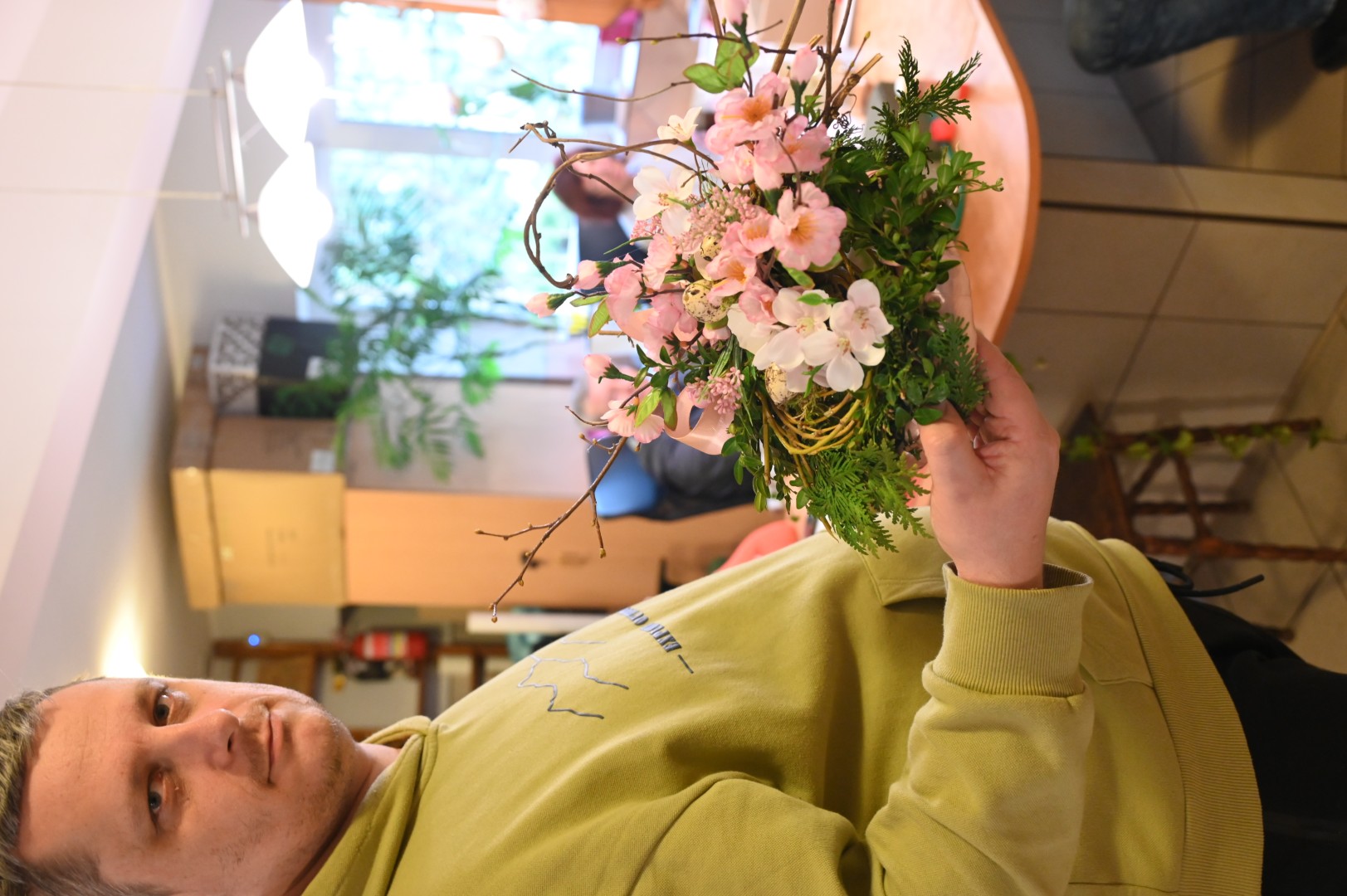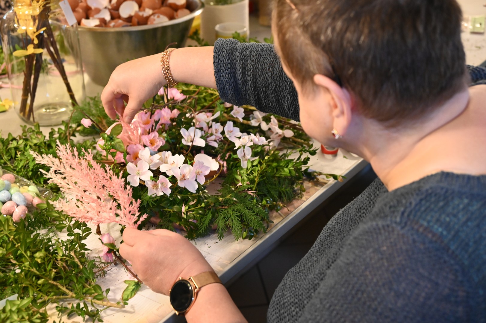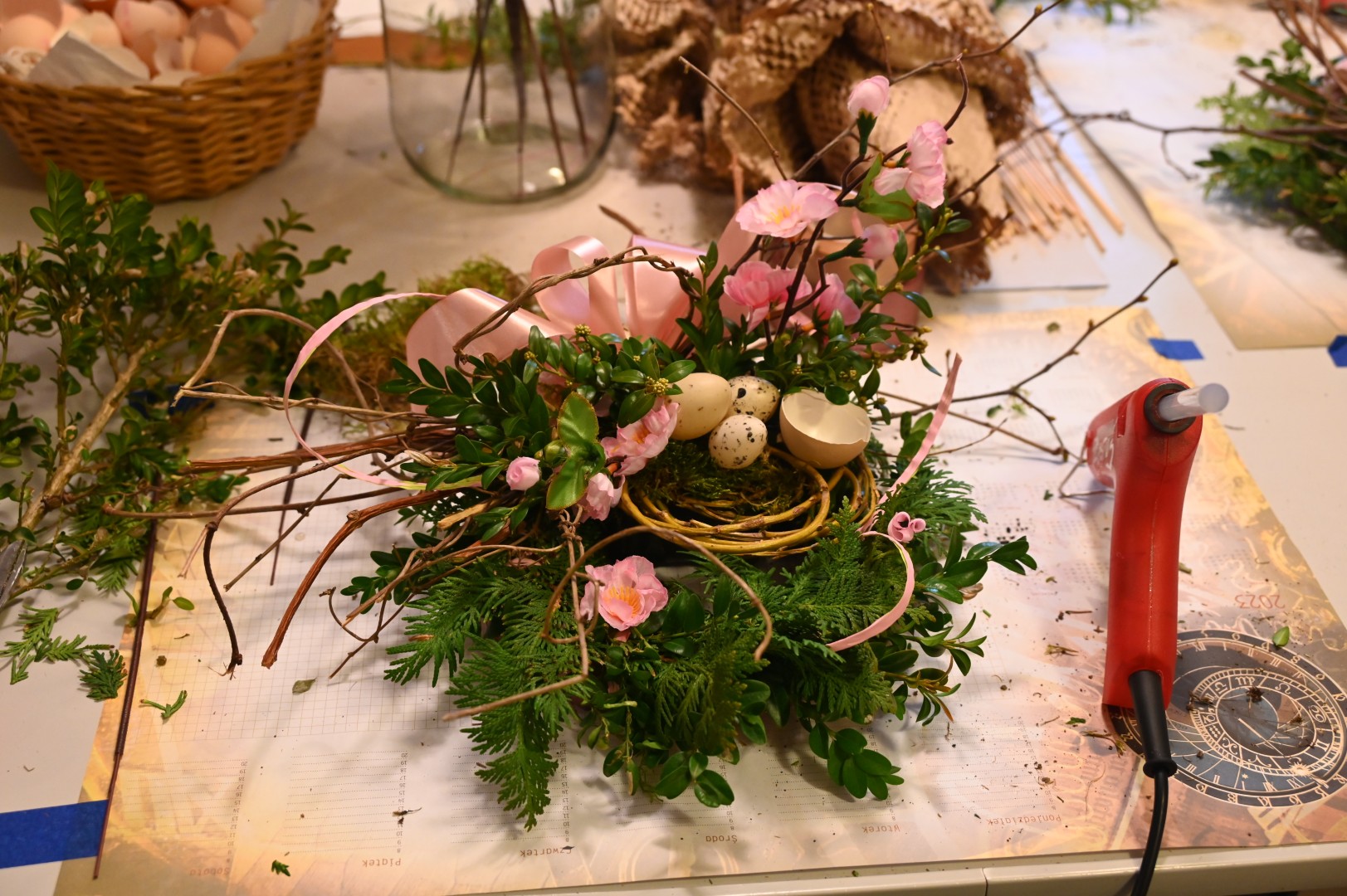Poszukaliśmy i odnaleźliśmy najlepszą florystkę w Elblągu i zaprosiliśmy ją do nas. Pani Anna Stoltmann-Stefaniak, doradca zawodowy, florystka pracująca w Centrum Kształcenia Zawodowego i Ustawicznego w Elblągu, nasze zaproszenie przyjęła chętnie i przyjechała do Tolkmicka w dniu 24 marca 2025 roku. Przygotowywaliśmy się do tego spotkania, do prowadzonych wspaniale zajęć, przez długi czas albowiem florystyka wymaga pracy z surowcami naturalnymi, które najlepiej jest zdobyć i spreparować samemu, a nie po prostu kupić. Zbieraliśmy zatem mech, korę, skorupki jajek, bukszpan, gałązki tui, wierzby i wiśni, dodaliśmy do tego trochę materiałów ozdobnych typu wstążki i piórka, odrobinę sztucznych (jednak) kwiatków i wysypaliśmy całe to bogactwo na długi stół. I rozpoczęliśmy pracę pod kierunkiem Pani Anny. Nasze zadanie polegało na samodzielnym wykonaniu stroika świątecznego. Trzeba tu nadmienić, że florystyka dzieli się na kilka dziedzin, w tym na florystykę ślubną, żałobną, komunijną, okolicznościową i świąteczną, my zatem zaczęliśmy zgłębiać tajniki tej ostatniej.