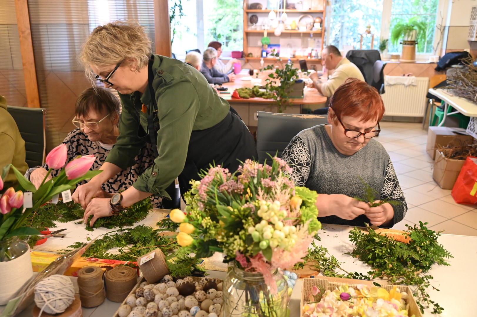 Otrzymawszy wcześniej przygotowany słomiany wianek (to było ułatwienie, albowiem ambitniej jest taki wianek wykonać jednak własnoręcznie) zaczęliśmy od techniki owijania wstążki, potem przyszła pora na naprawdę wymagającą cierpliwości i zręczności technikę wicia. Dalej poznaliśmy technikę mocowania bazy pod stroik, do bazy przytwierdzaliśmy pęki gałązek wiśni i gniazdko z witek wierzby, następnie przeszliśmy do fazy techniki moszczenia gniazdka przy pomocy mchu, piórek i sianka – trzeba było te materiały powiązać przy użyciu tzw. rzymskich haftek. I wreszcie finalnie wyżywaliśmy się przy technice dekorowania stroika używając do tego celu kwiatów, jajeczek, kory, znowu piórek. W tej fazie każdy z uczestników mógł już popuścić wodze fantazji i wykazać się kreatywnością i oryginalnością. Na koniec uczestnicy warsztatów z dumą zaprezentowali wykonane samodzielnie, choć pod światłym kierunkiem profesjonalnej florystki, stroiki wielkanocne - kolorowe, imponujące w każdym calu, prawie perfekcyjne.